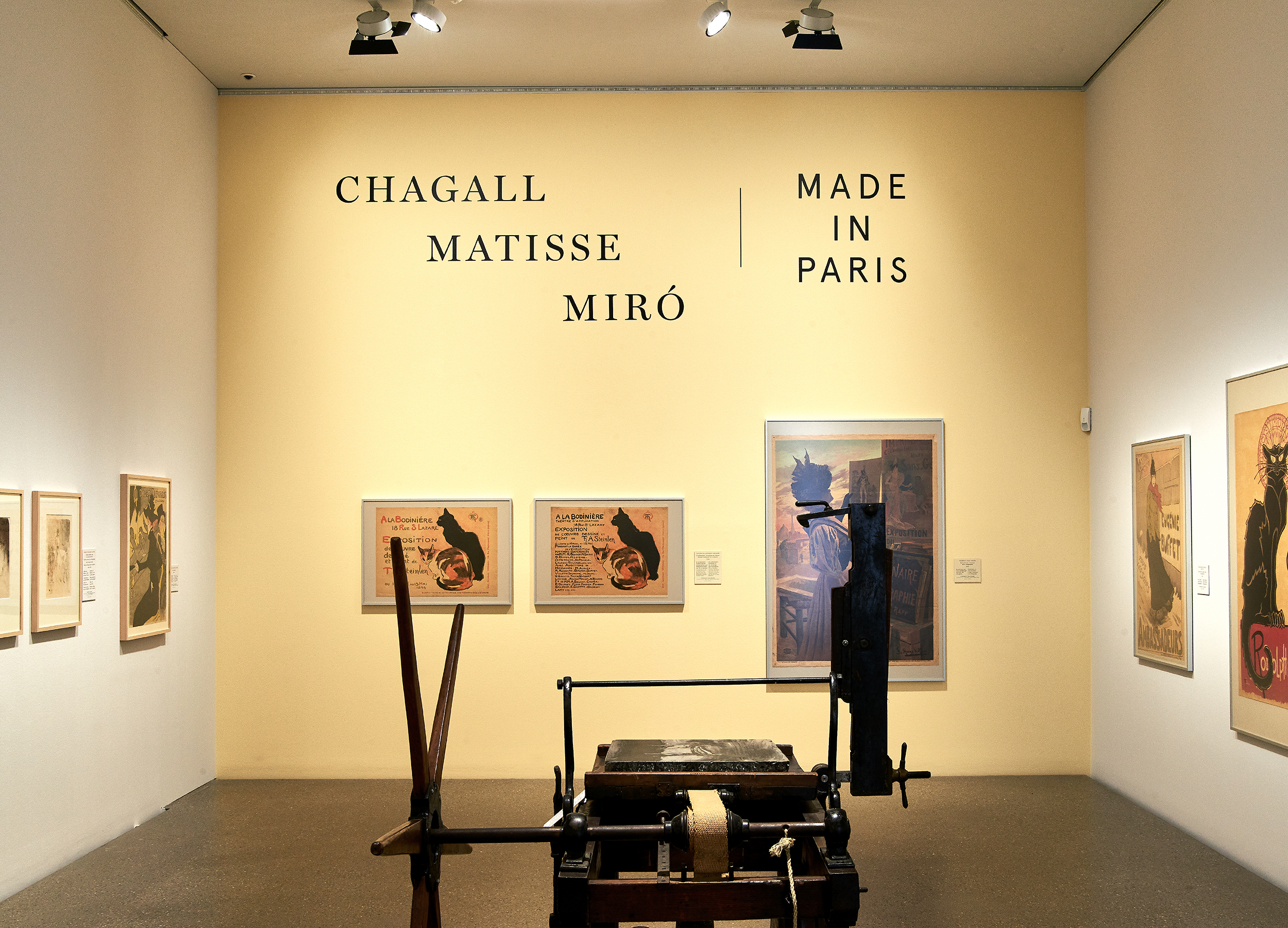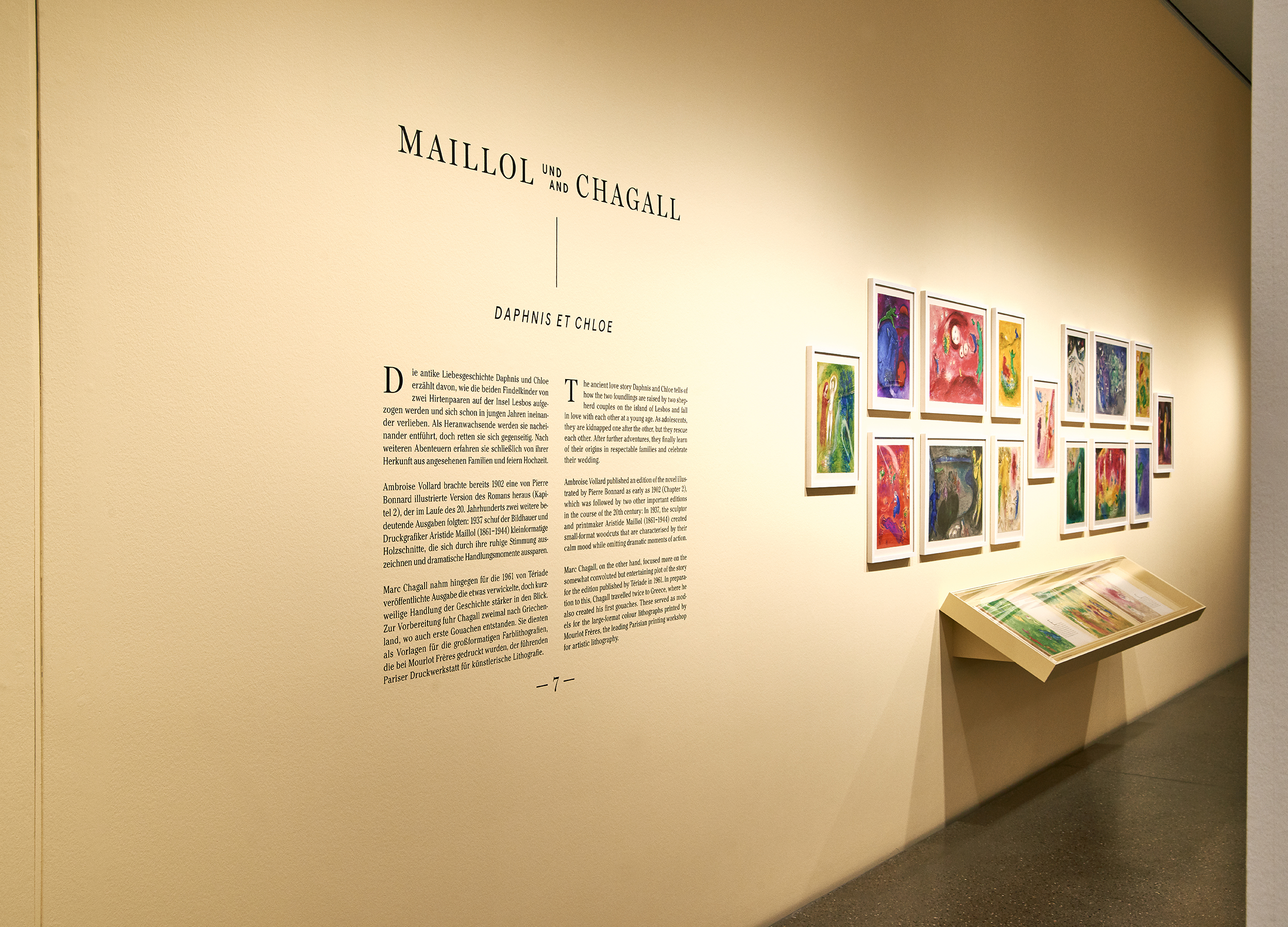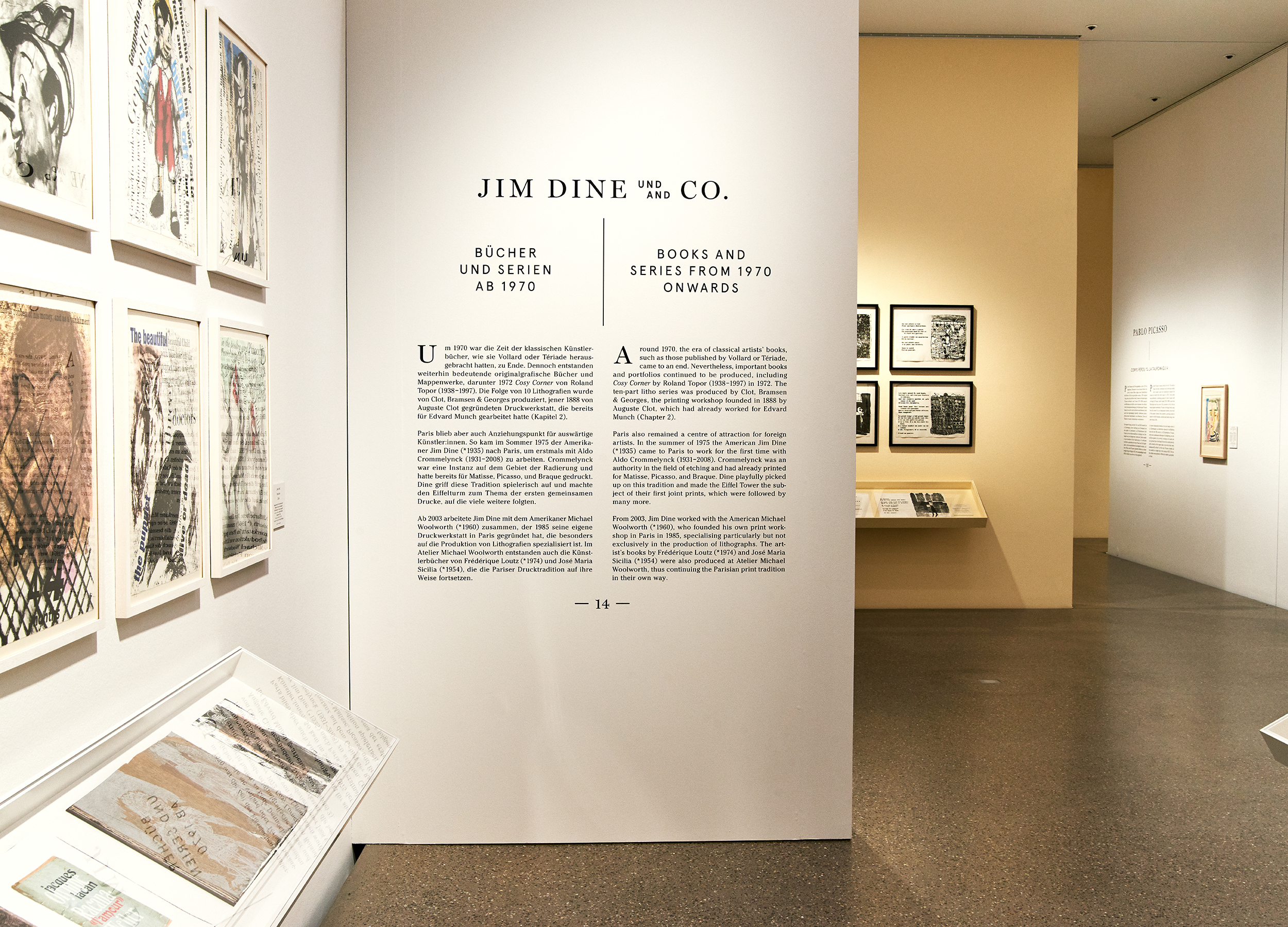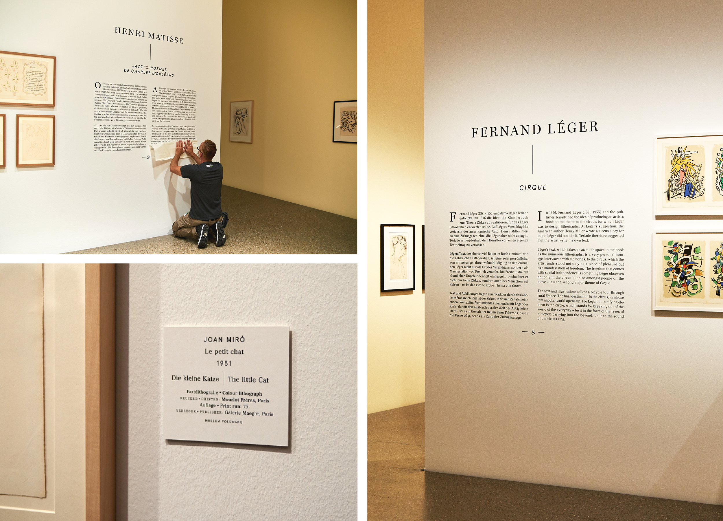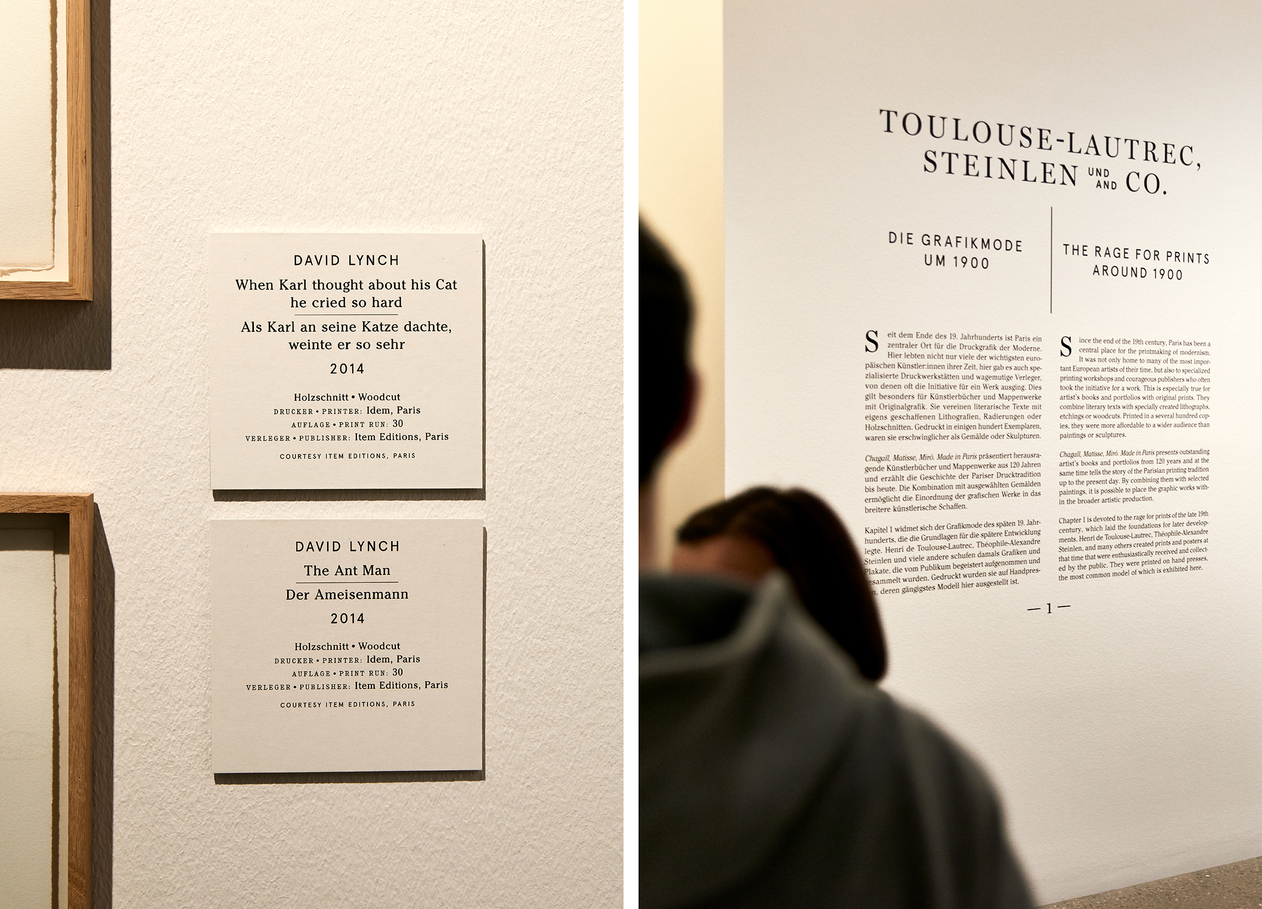 Die Ausstellung »Chagall, Matisse, Miró – Made in Paris« im Essener Museum Folkwang schlägt einen Bogen über hundert Jahre Druckgrafik mit dem Fokus auf Paris. Hier saßen die Drucker und Verleger, die die Arbeiten der verschiedenen Künstler produzierten und publizierten. Für die Ausstellungsgrafik entwickelten wir eine Gestaltung, die sich historischer Stilmittel bedient, gleichzeitig aber modern und elegant wirkt.