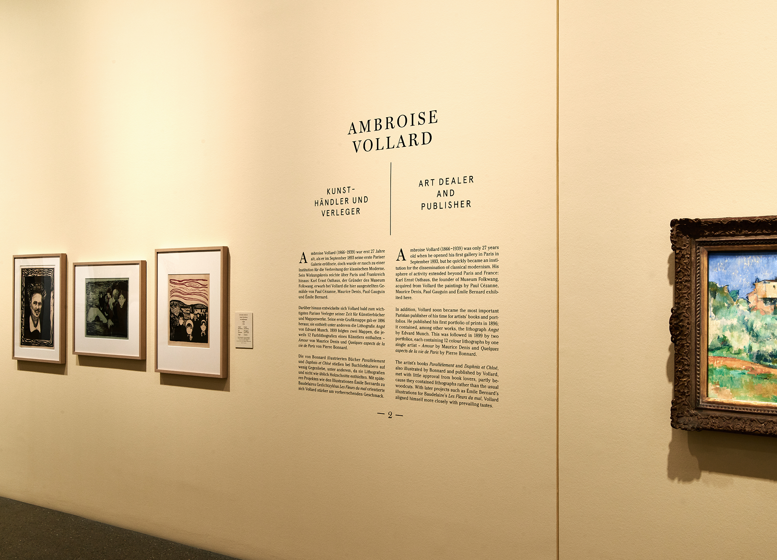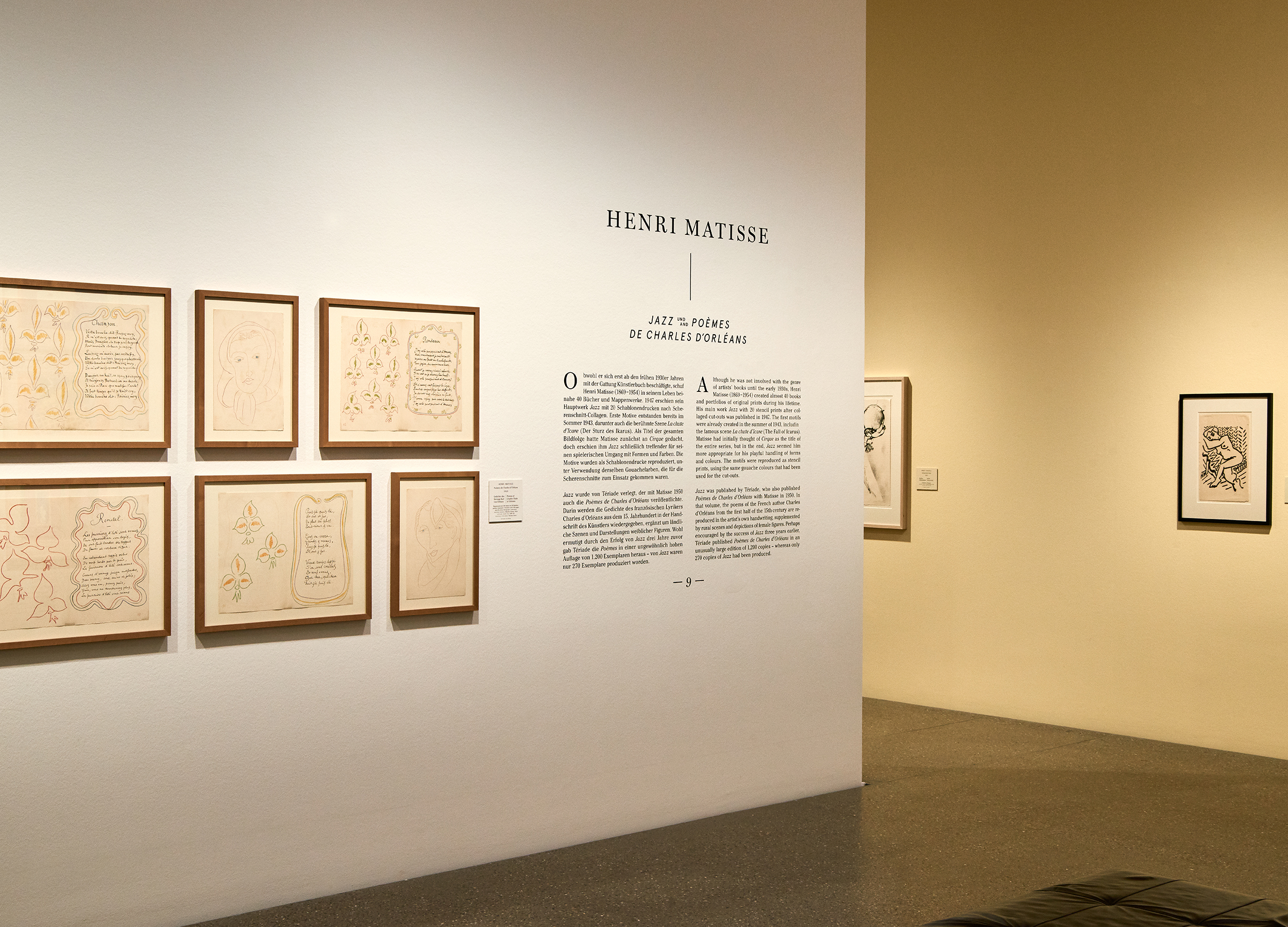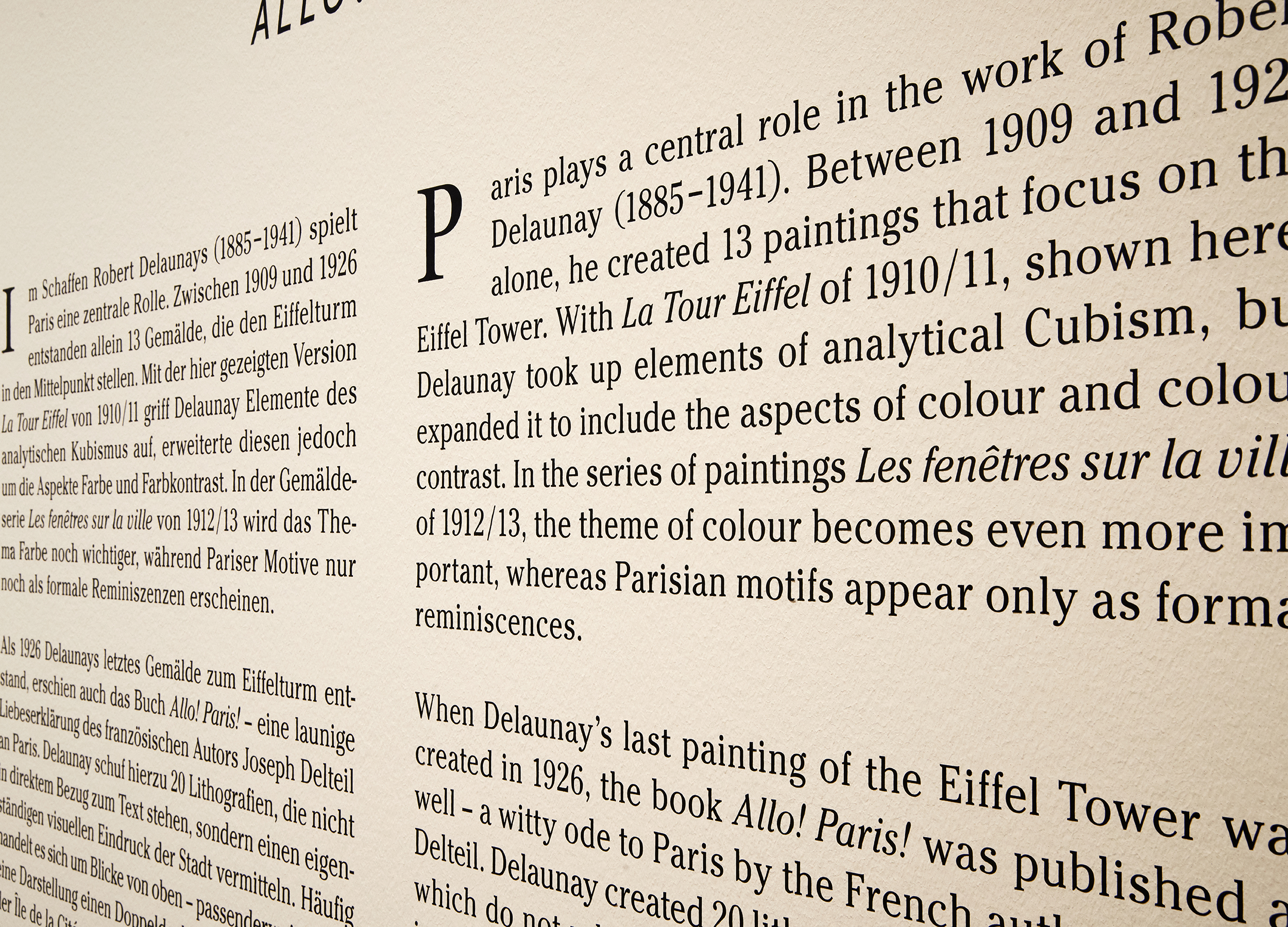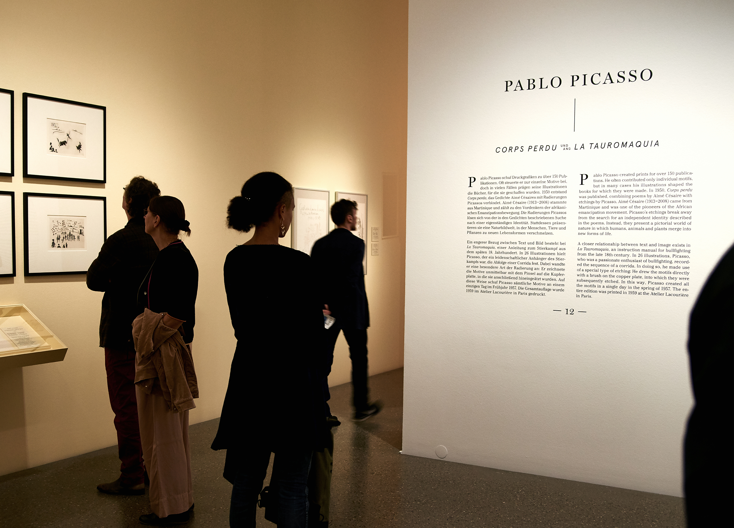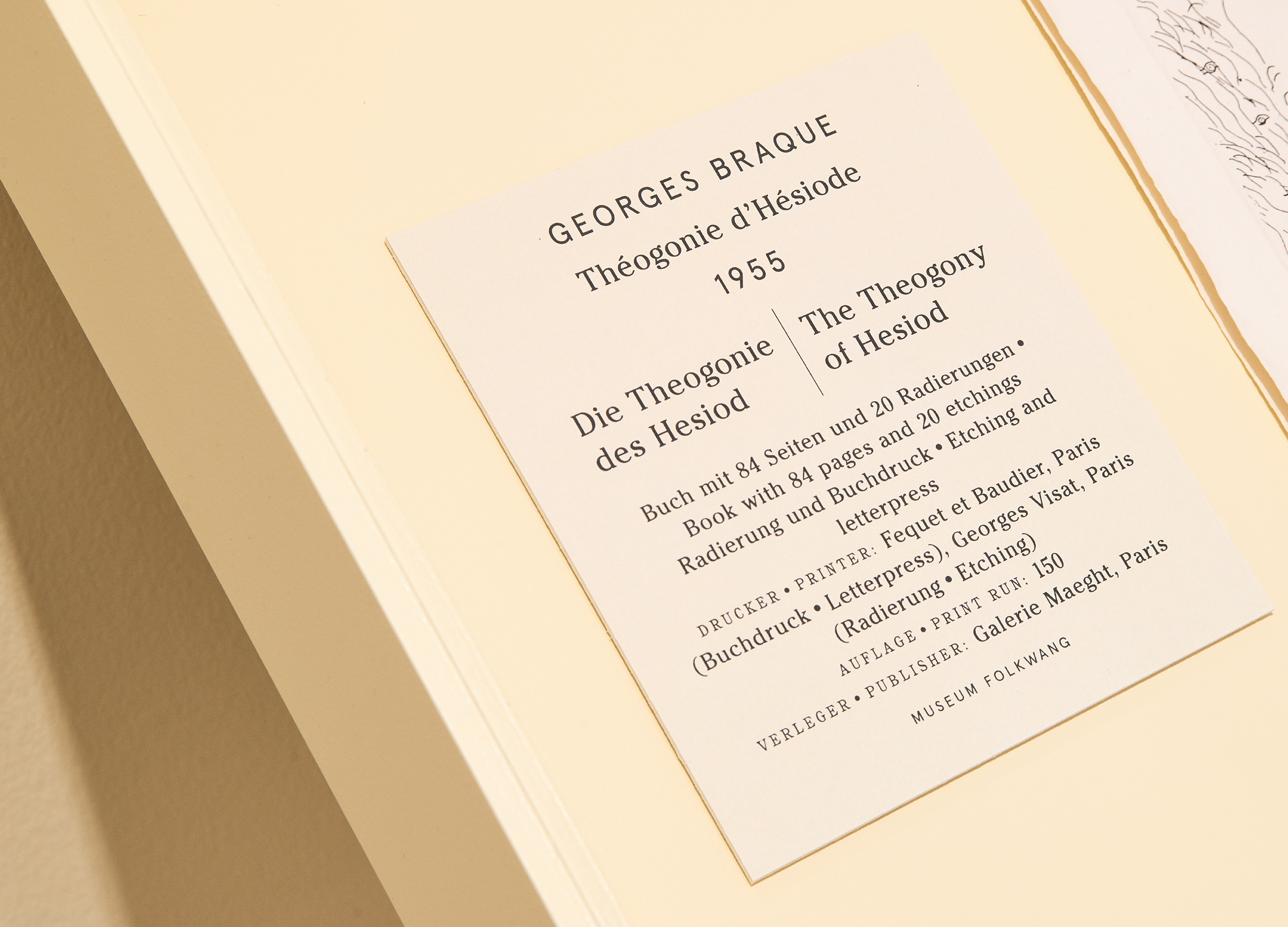 Die Ausstellung »Chagall, Matisse, Miró – Made in Paris« im Essener Museum Folkwang schlägt einen Bogen über hundert Jahre Druckgrafik mit dem Fokus auf Paris. Hier saßen die Drucker und Verleger, die die Arbeiten der verschiedenen Künstler produzierten und publizierten. Für die Ausstellungsgrafik entwickelten wir eine Gestaltung, die sich historischer Stilmittel bedient, gleichzeitig aber modern und elegant wirkt.