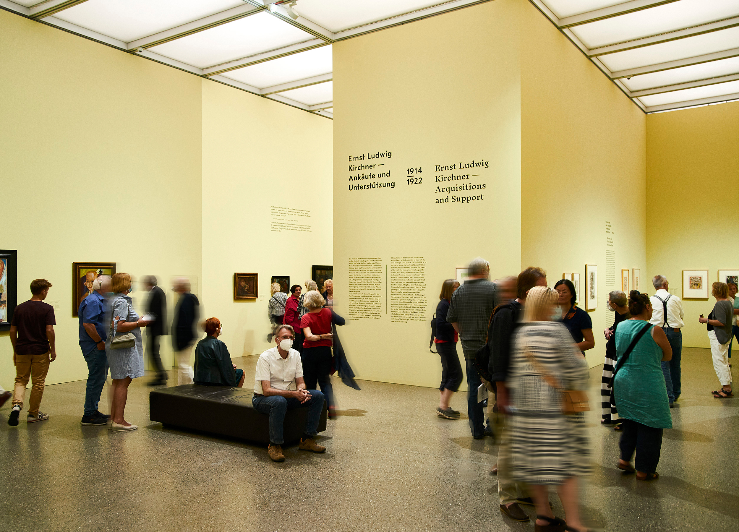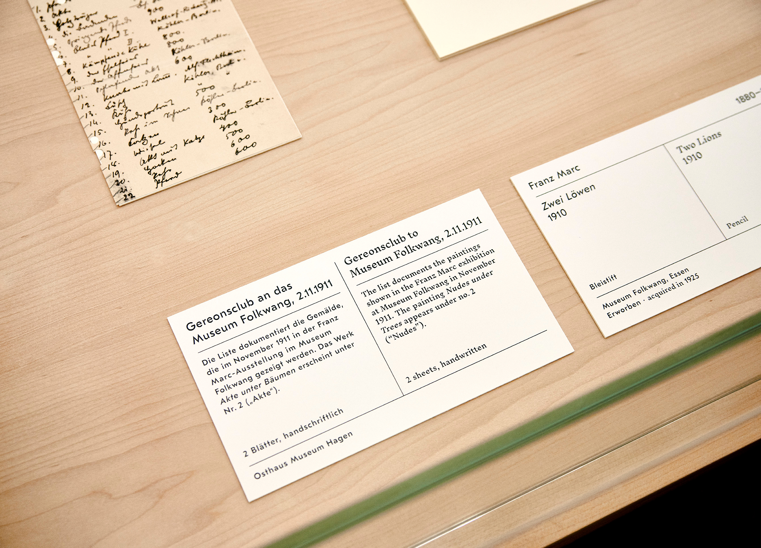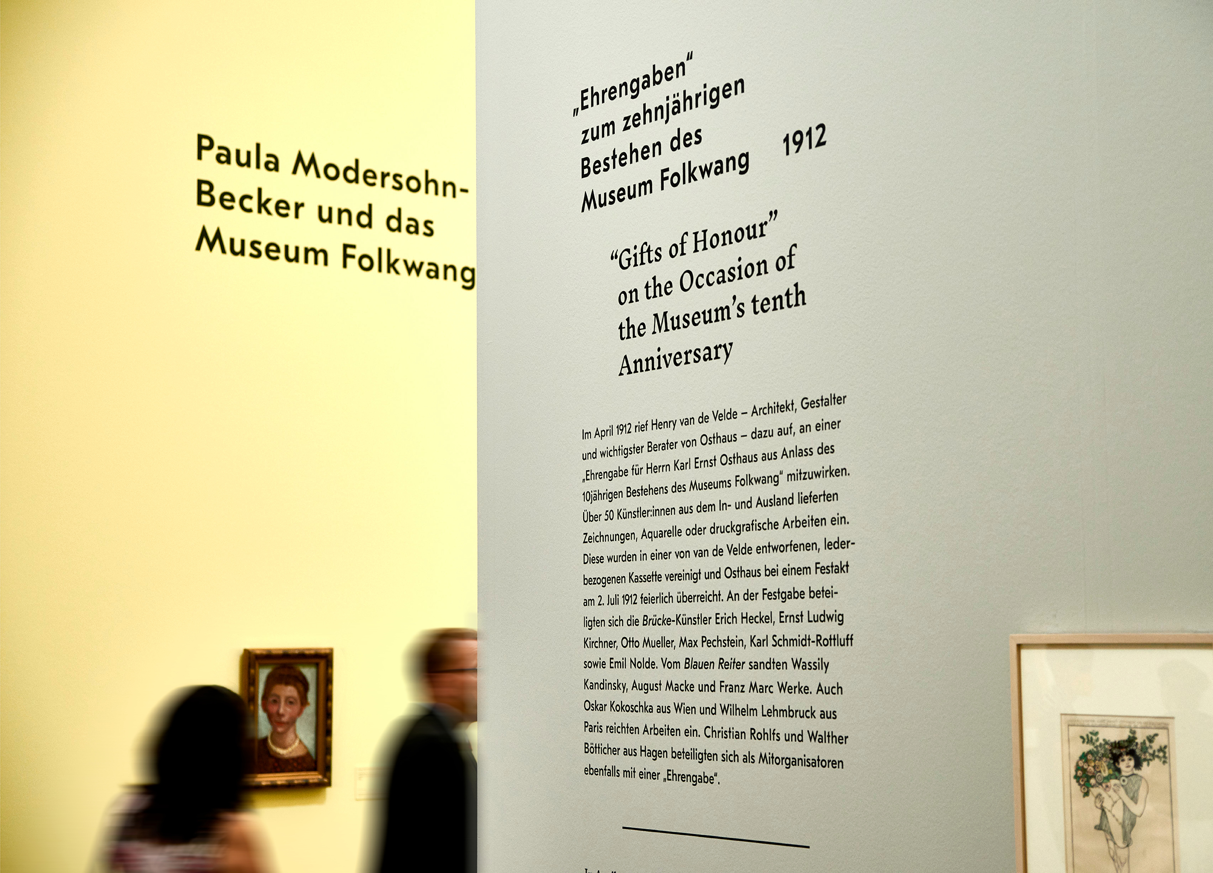 Die Ausstellung »Expressionisten am Folkwang« zeichnet die Pionierrolle der von Osthaus gegründeten Sammlung nach. In der Gestaltung finden sich gestalterische Zeitbezüge, diese werden jedoch mit zeitgenössischen Herangehensweisen gemischt. Als relativ textlastige Ausstellung haben wir besonderes Augenmerk auf die Lesbarkeit in allen Informationsebenen gelegt.