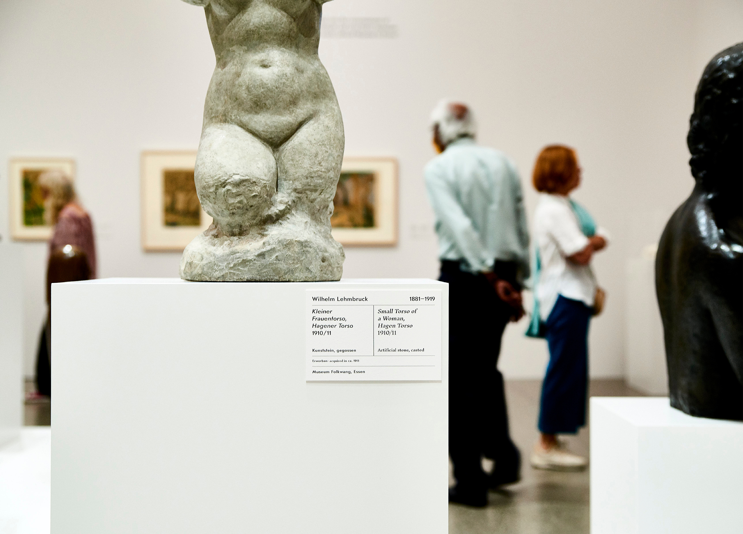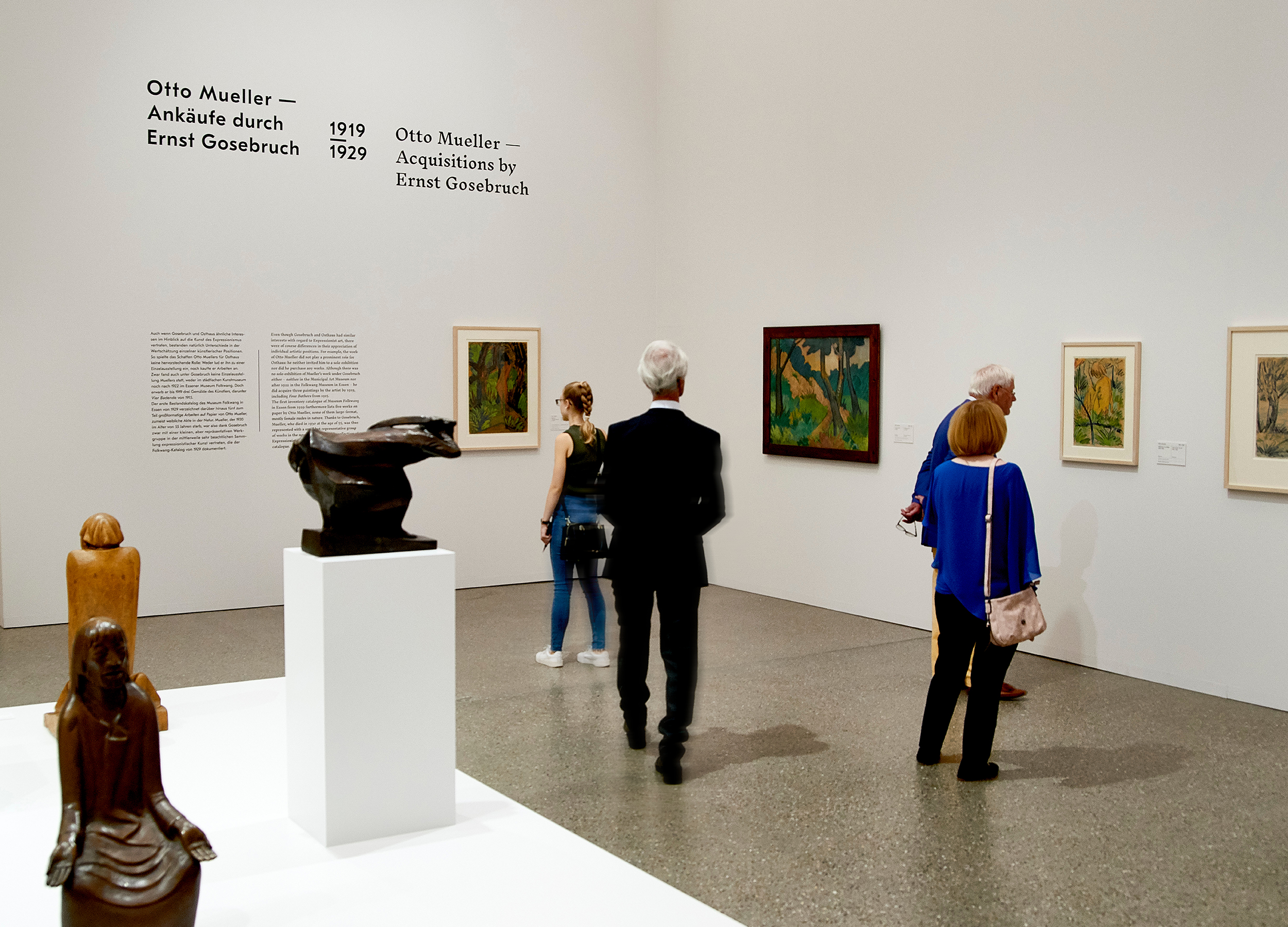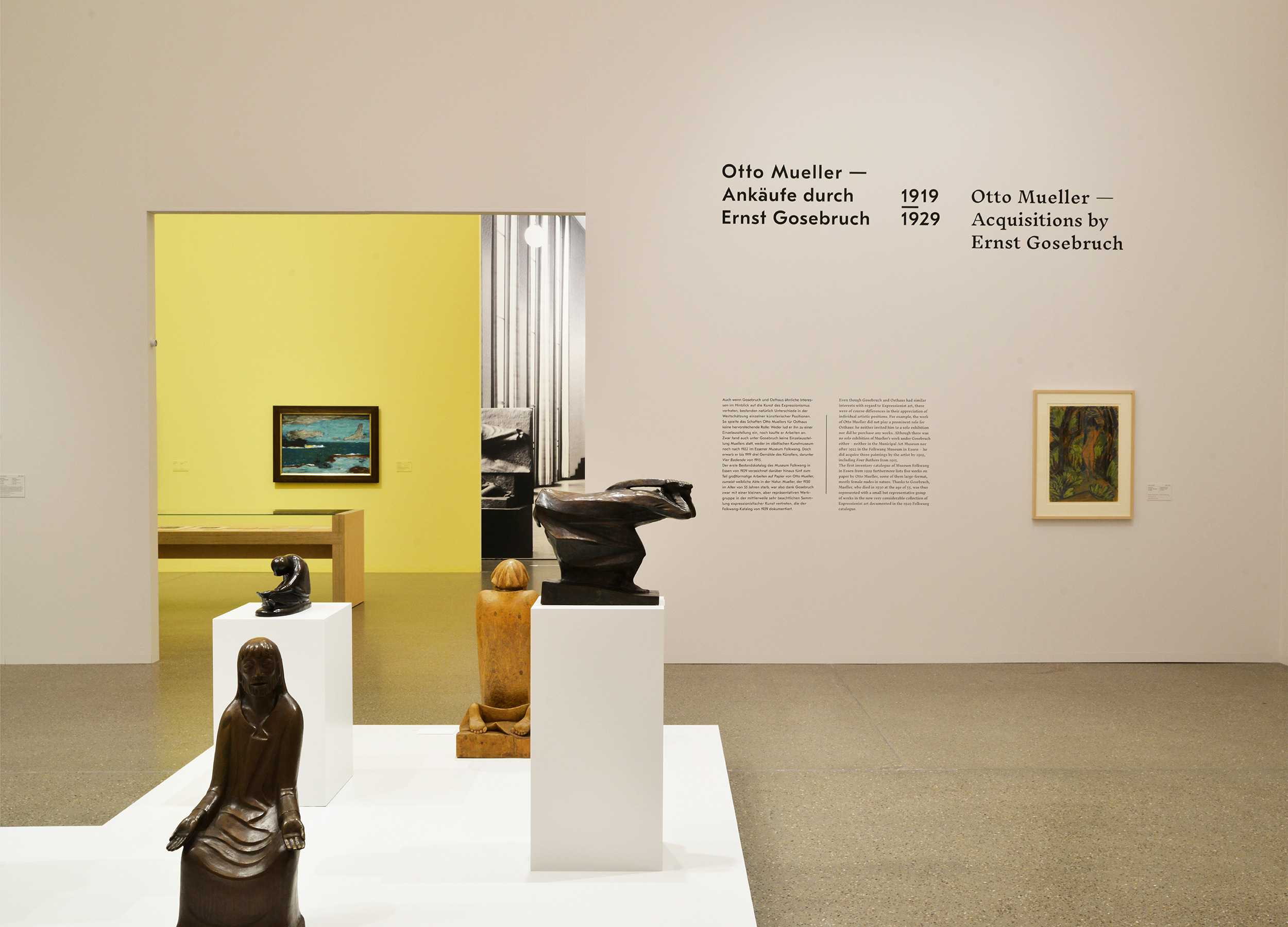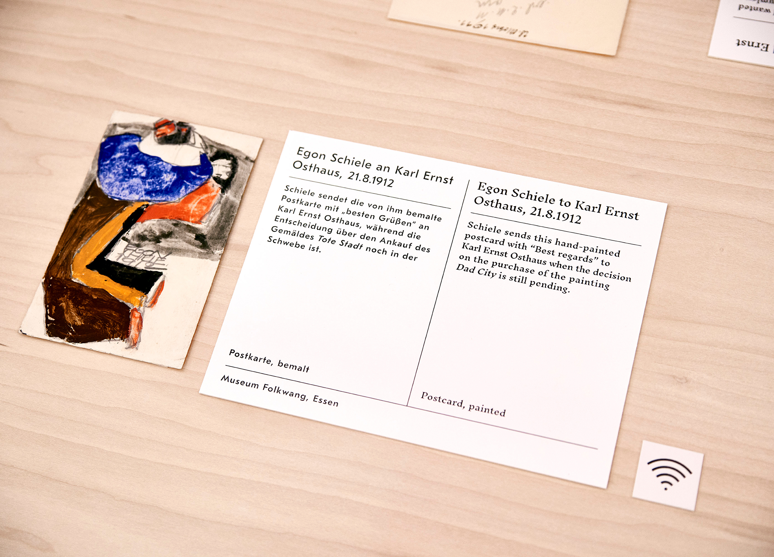 Die Ausstellung »Expressionisten am Folkwang« zeichnet die Pionierrolle der von Osthaus gegründeten Sammlung nach. In der Gestaltung finden sich gestalterische Zeitbezüge, diese werden jedoch mit zeitgenössischen Herangehensweisen gemischt. Als relativ textlastige Ausstellung haben wir besonderes Augenmerk auf die Lesbarkeit in allen Informationsebenen gelegt.