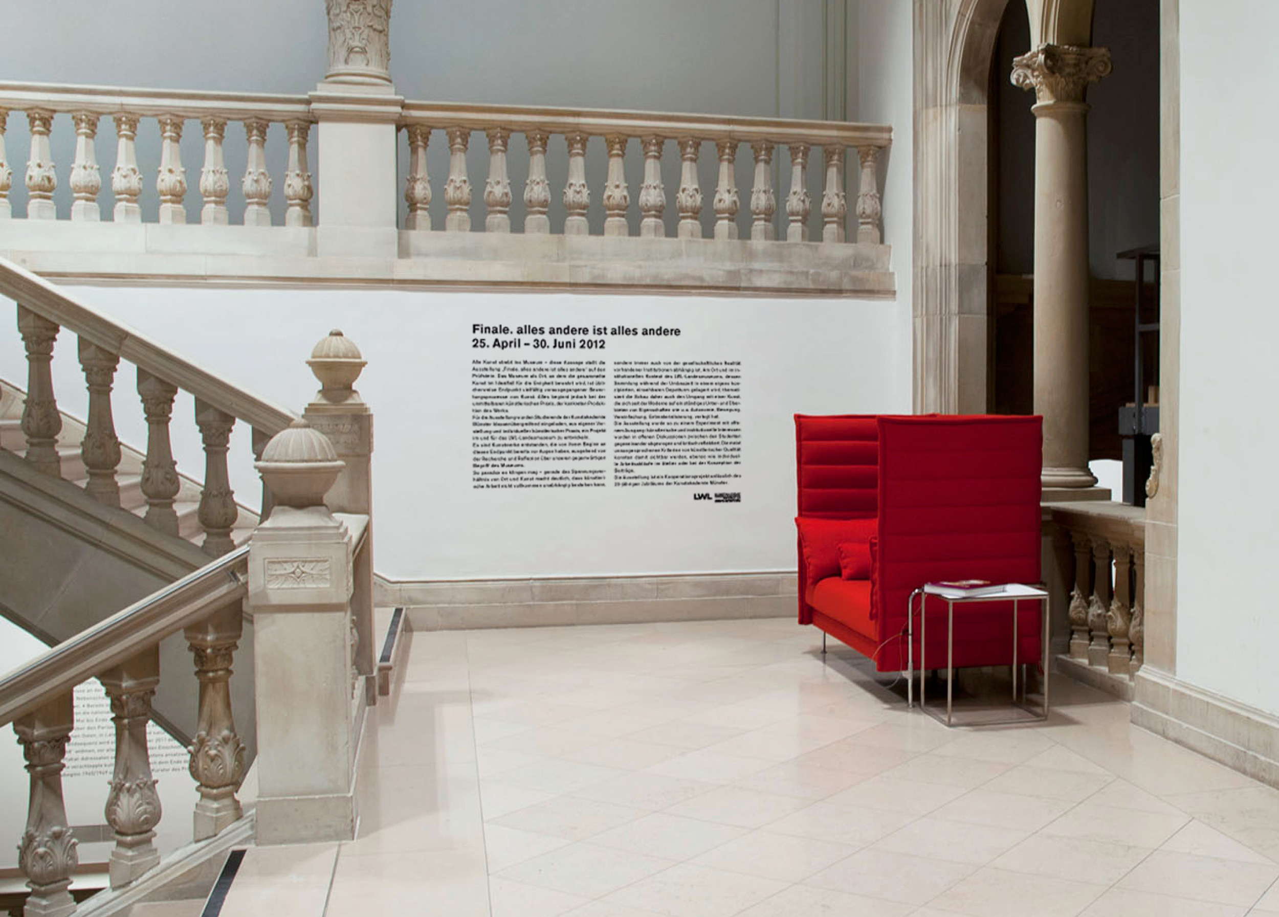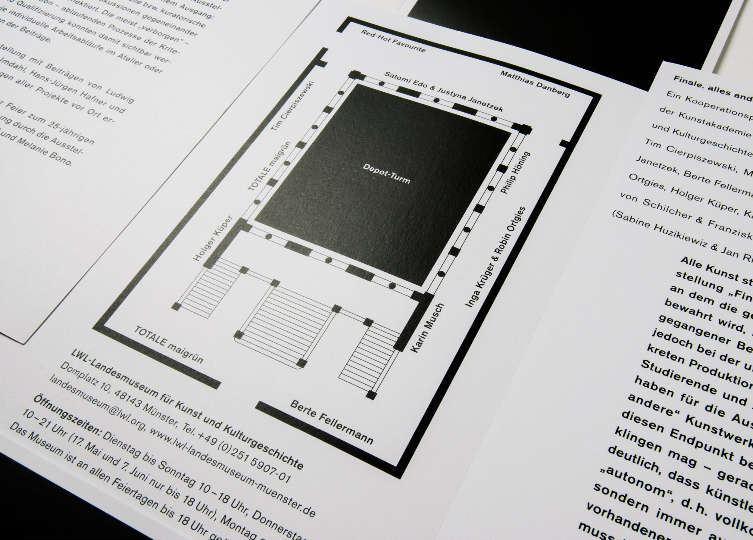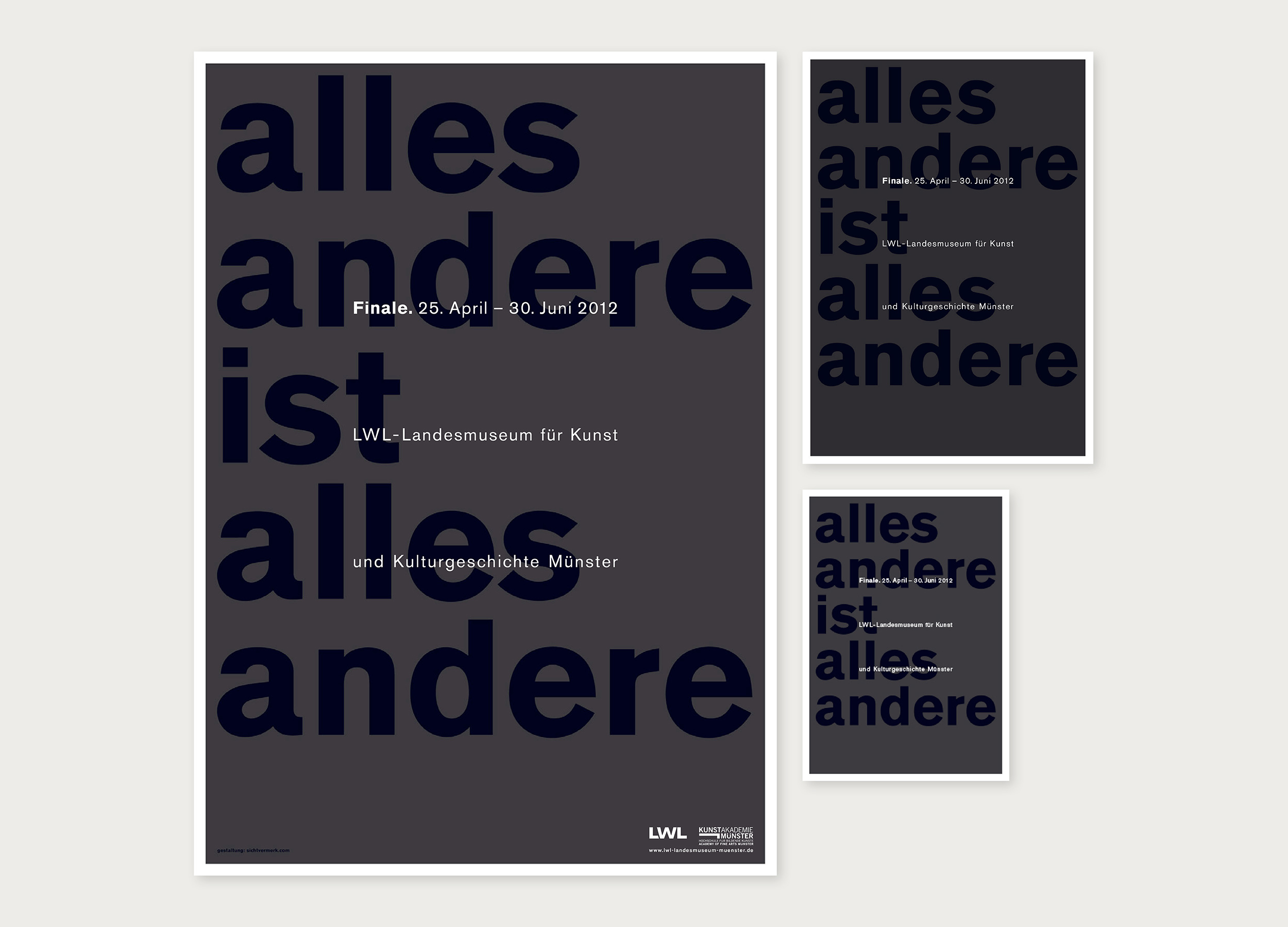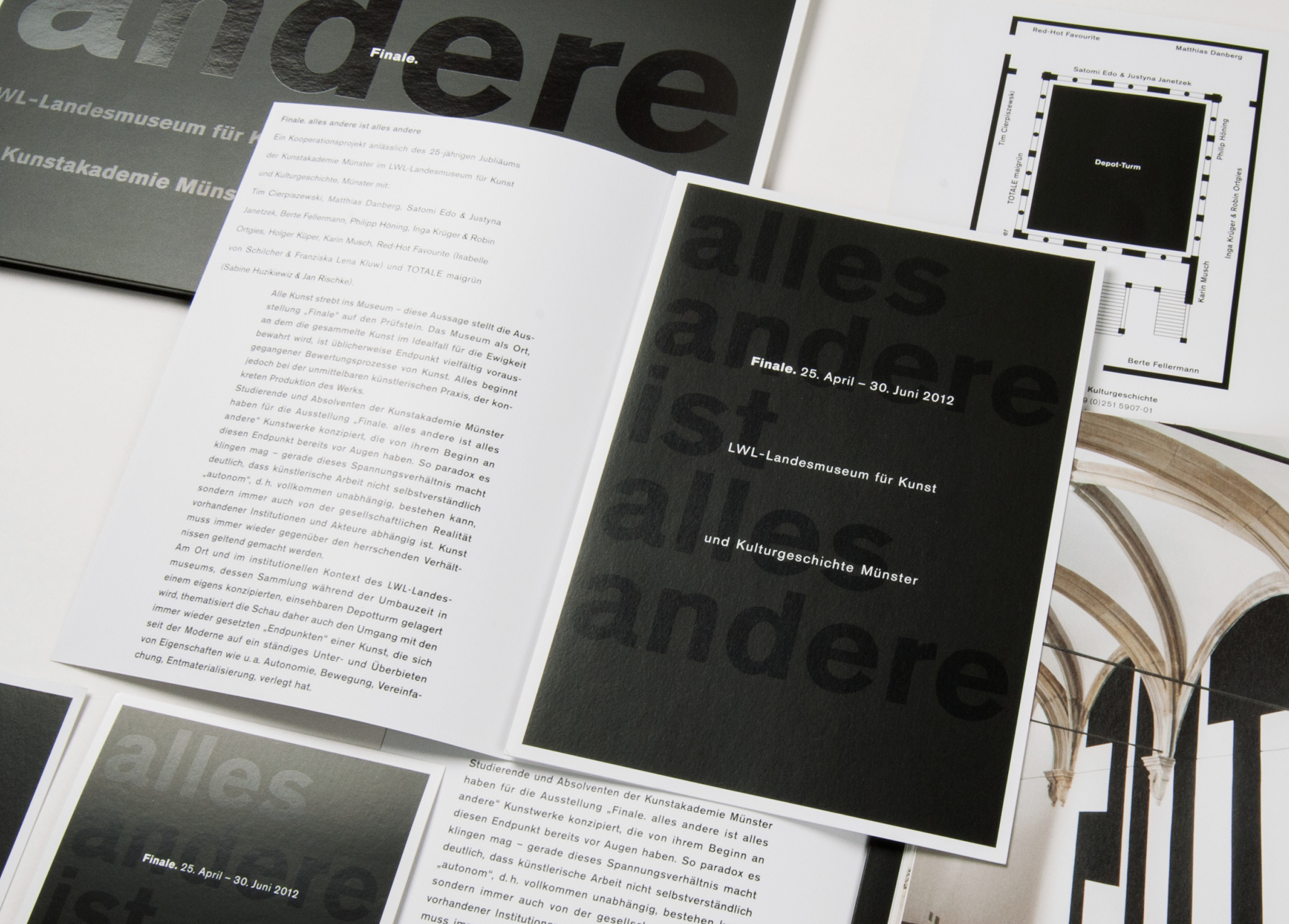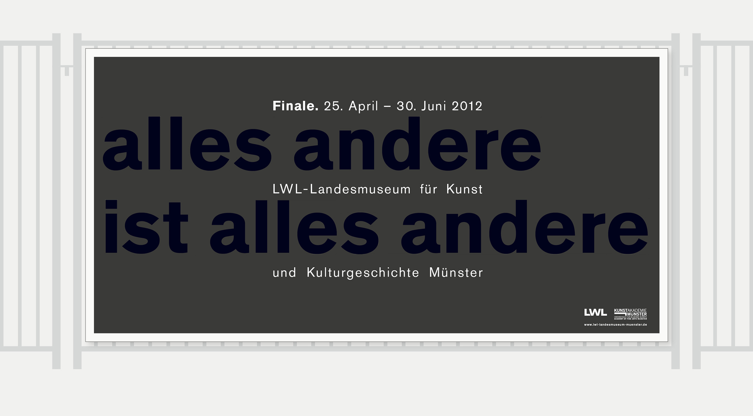 Die Ausstellung »Finale. alles andere ist alles andere«, eine Kooperation zwischen dem Landesmuseum für Kunst und Kulturgeschichte und der Kunsthochschule Münster, lud junge Künstlerinnen und Künstler ein, Stellung zur Kontextualität aktueller Kunst und der Frage nach sogenannten Endpunkten der Kunstgeschichte zu nehmen. »alles andere ist alles andere« ist die Übersetzung eines Zitates von Ad Reinhardt: »Art is art. Everything else is everything else.« Bezug nehmend auf seine »letzten« (›schwarzen‹) Bilder ist sein Zitat in Farbe in den Hintergrund gedruckt, wird aber schwarz überdruckt, so dass sich ein noch schwärzeres Schwarz ergibt.