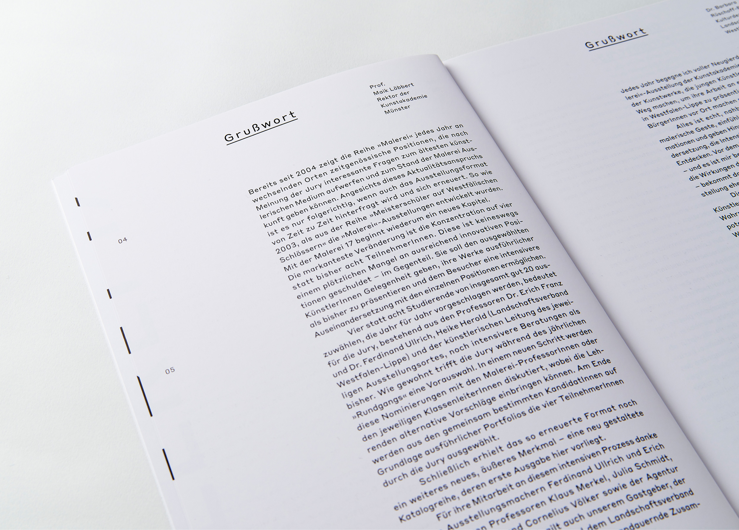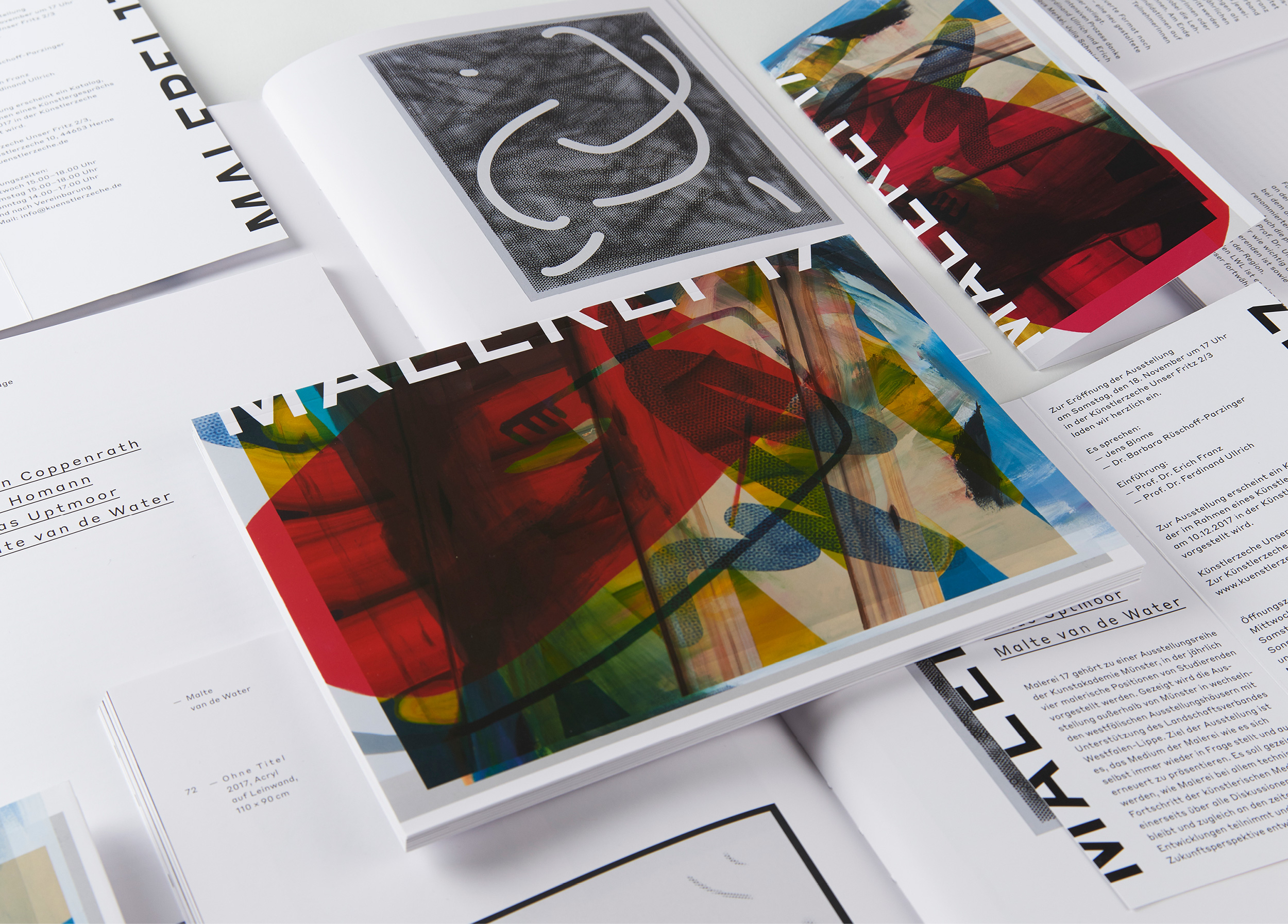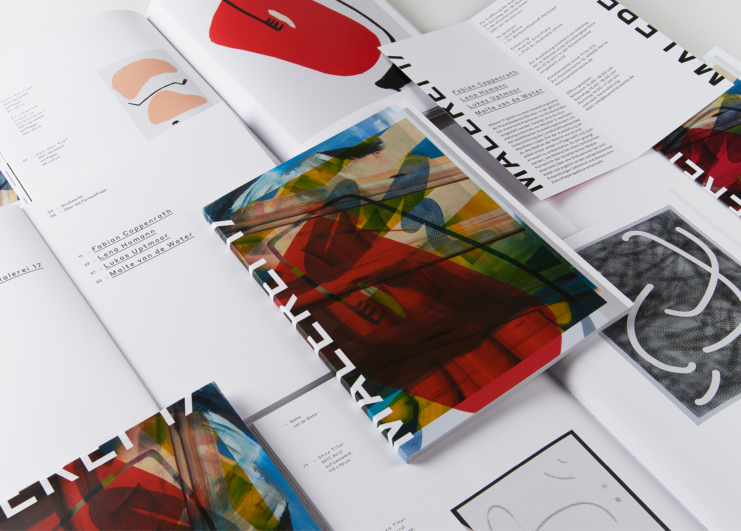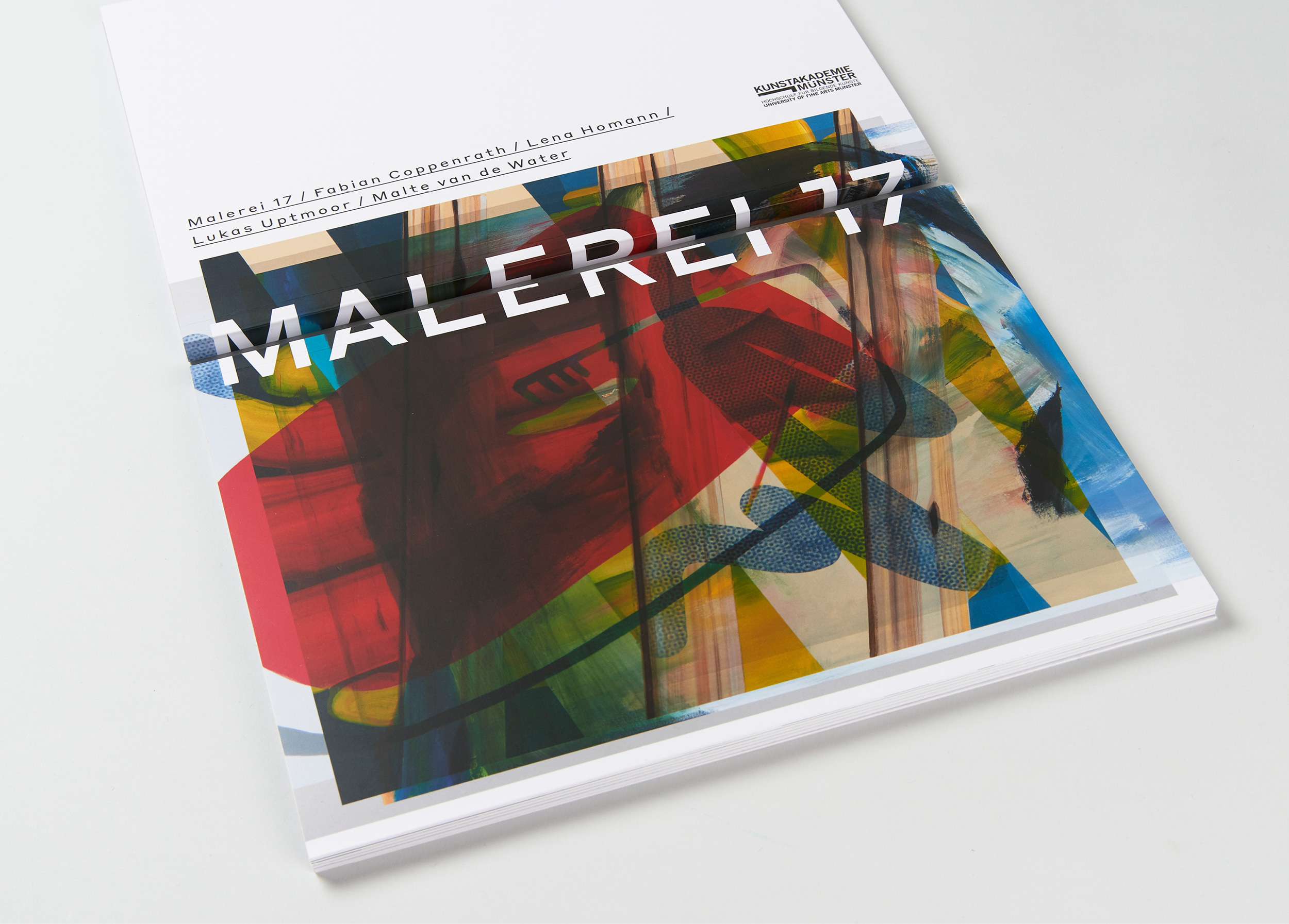 Jedes Jahr gibt die Kunstakademie Münster vier Studierenden aus dem Bereich Malerei die Möglichkeit ihre Arbeiten im Rahmen einer Ausstellung und eines Kataloges zu Präsentieren. Die Gestaltung ist als Reihe konzipiert. Das Covermotiv ergibt sich aus einer Überlagerung von Ausschnitten von Arbeiten aller vier Künstler.