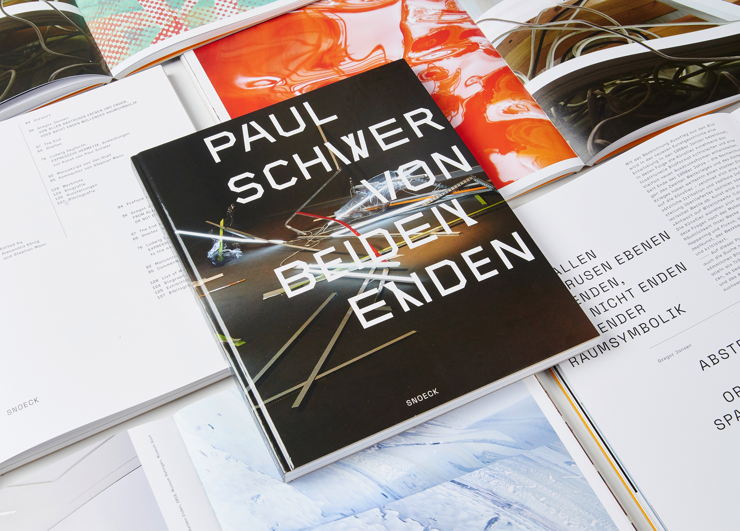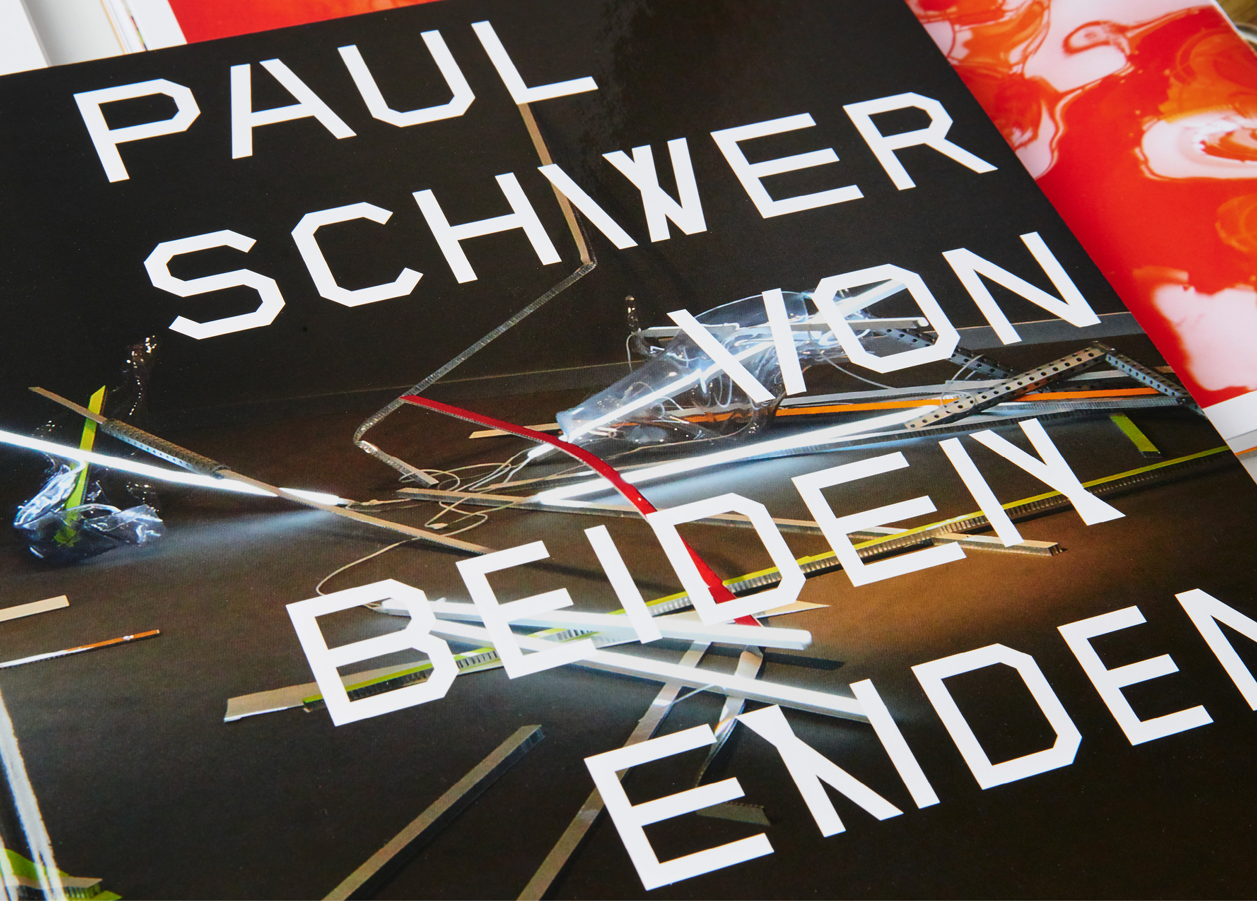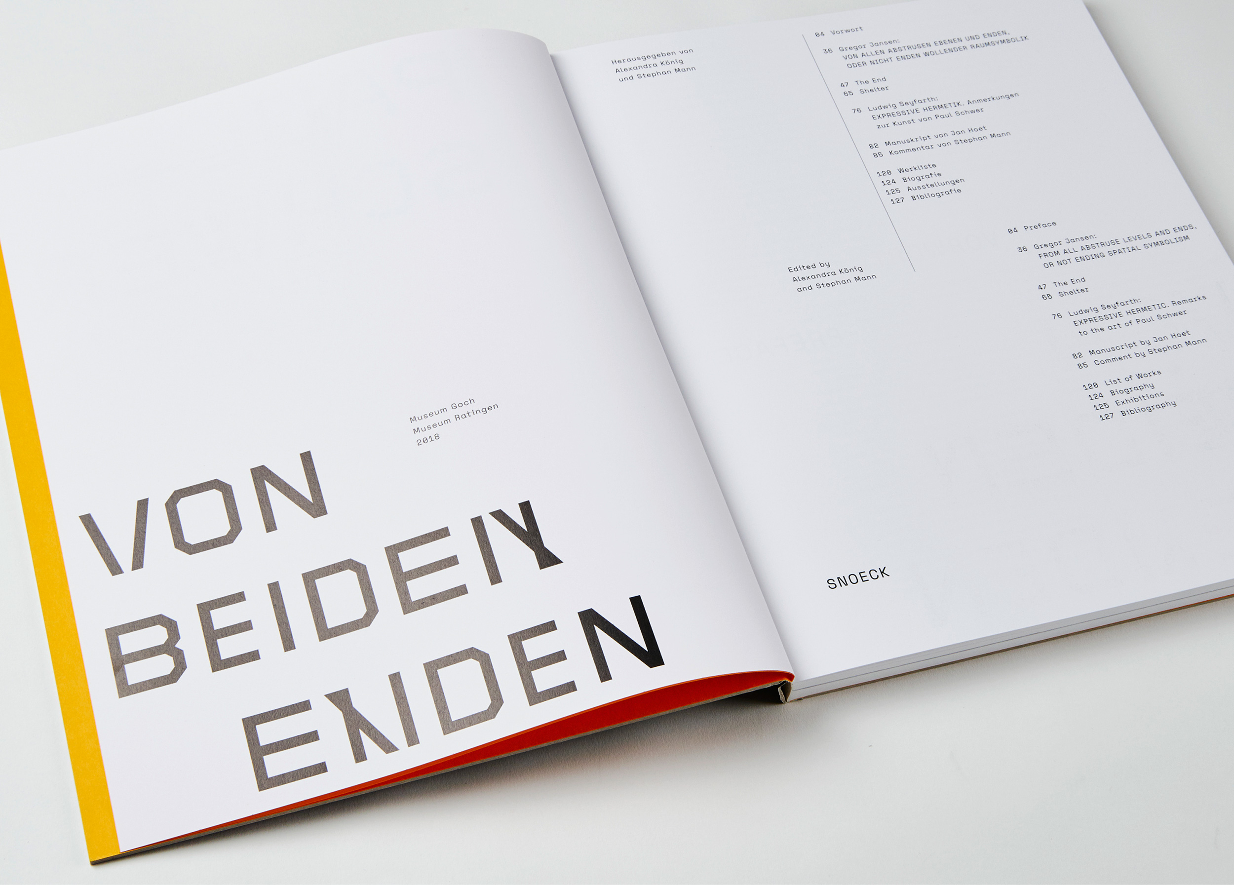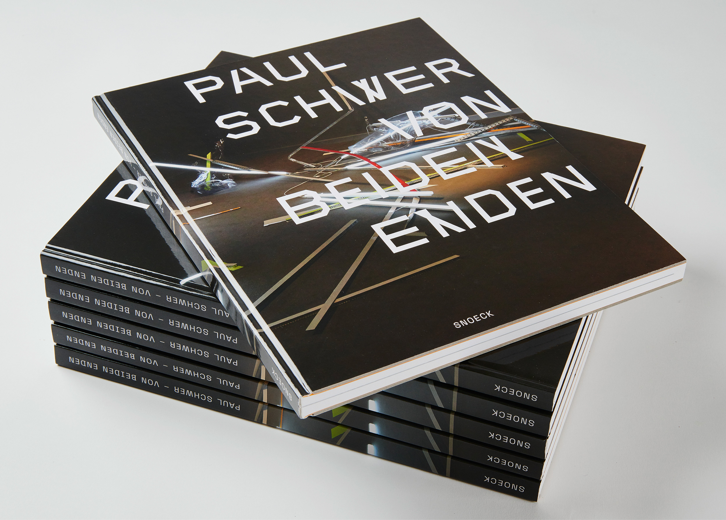 Die Doppel‐Ausstellung »Von beiden Enden« fand unter den Motti »The End« und »Shelter« parallel in den Museen Ratingen und Goch statt. Der Katalog stellt sie sowohl thematisch als auch räumlich ins Zentrum und nähert sich ihnen gleichsam von beiden Enden des Buches: Verschiedene Werkgruppen Schwers werden anhand von früheren Arbeiten dargestellt und verdichten sich in der Mitte des Kataloges in der Darstellung der beiden Ausstellungen. Durch zunächst unerwartete Bild‐Gegenüberstellungen wird der oft komplexe Werkprozess für den Betrachter nachvollziehbar gemacht.
