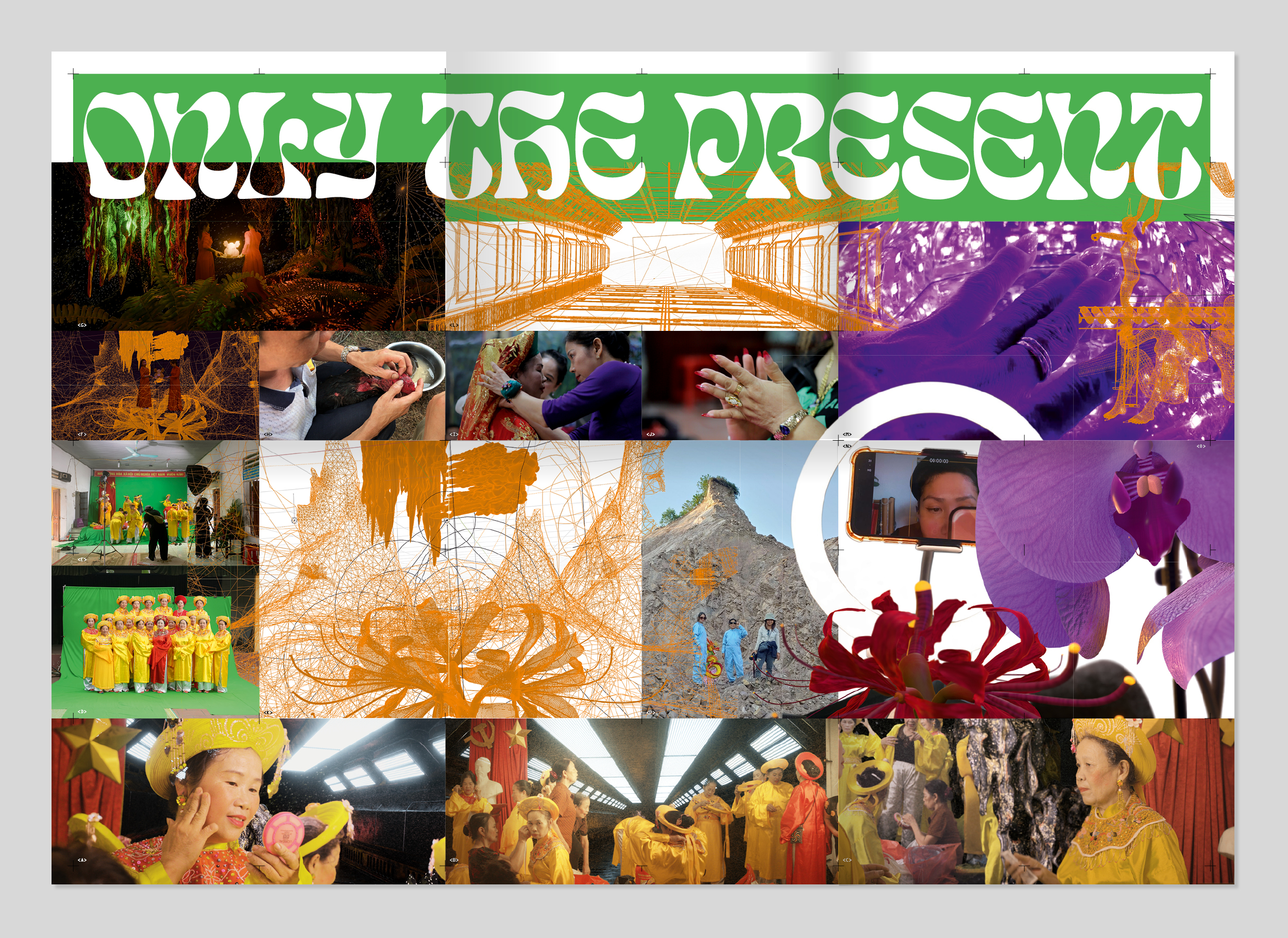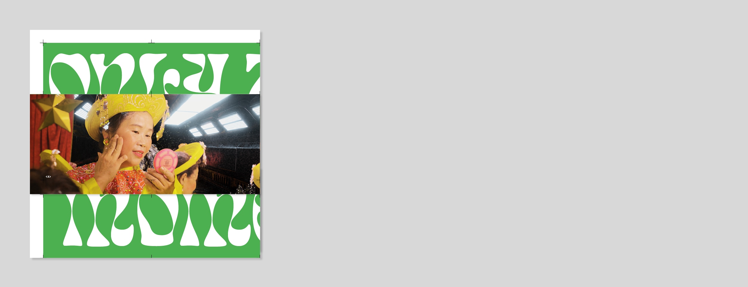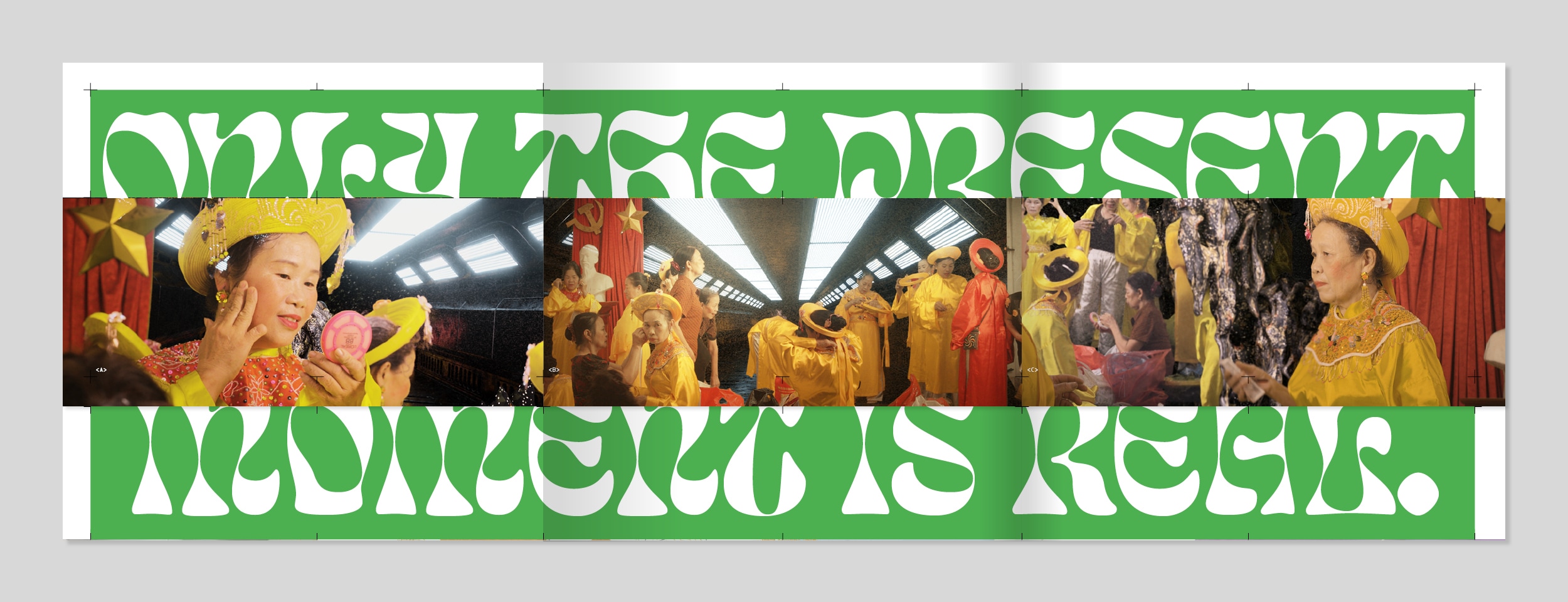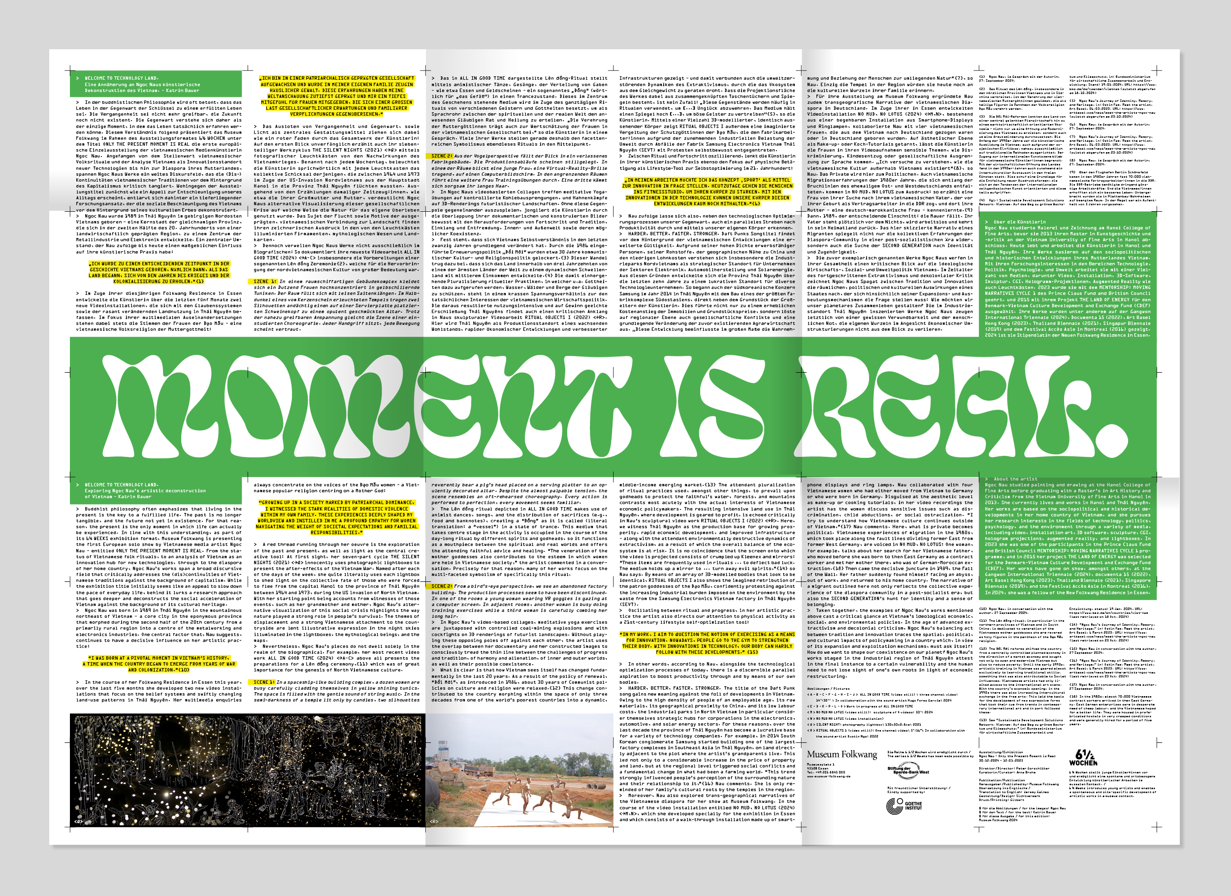 Für die Ausstellung der vietnamesischen Künstlerin Ngoc Nau haben wir eine Publikation entwickelt, die sowohl als Plakat, wie auch als Reader funkioniert. Durch eine spezielle Faltung wird das Bild einer Videoarbeit ins Zentrum gerückt. Beim Aufflaten sieht man dann alle drei Panels der 3-Kanal-Installation. Die Plakat-Seite ist eine große Kollage aus diversen Arbeiten und Drahtigttermodellen ihrer digitalen Landschaften.