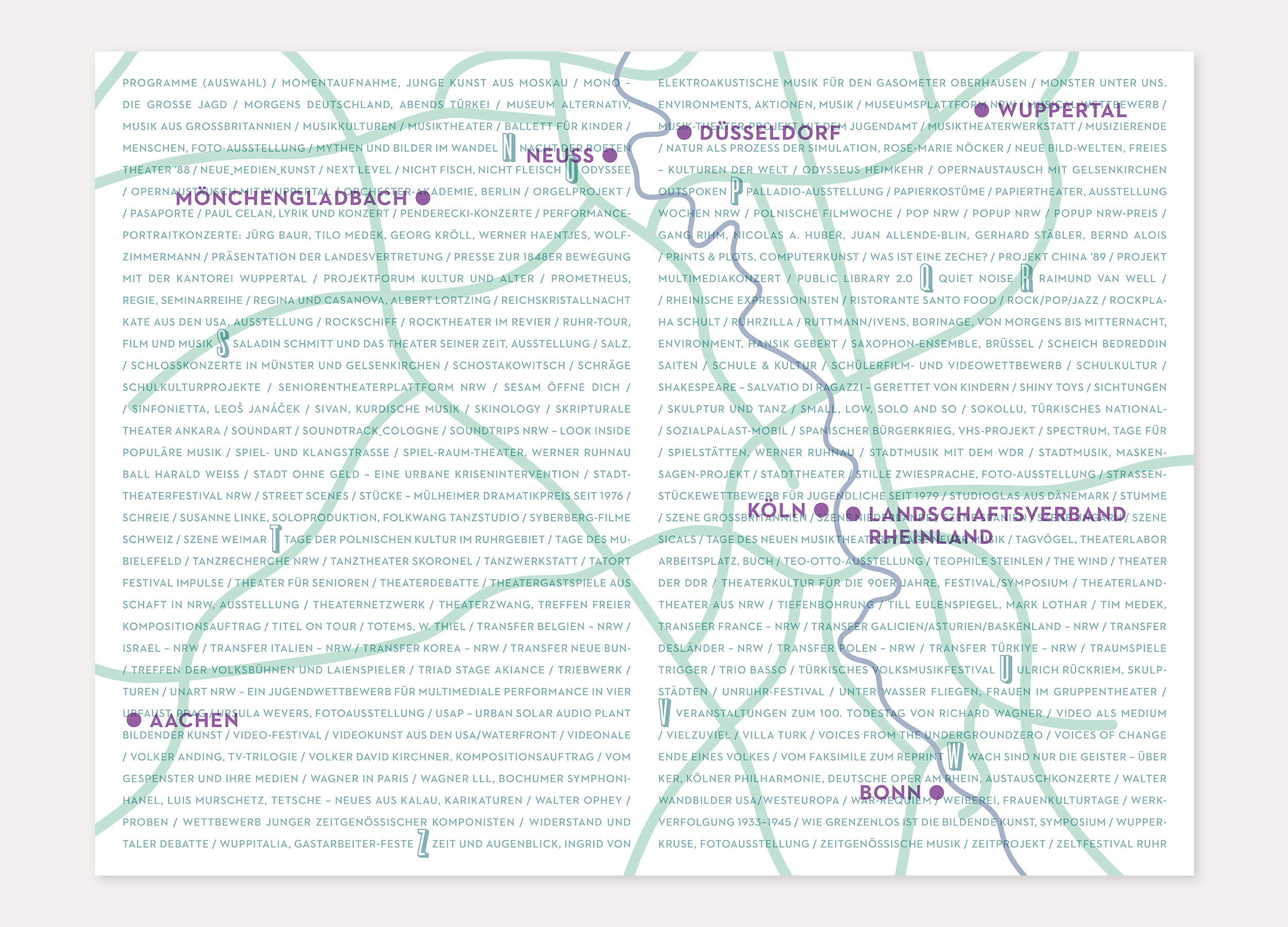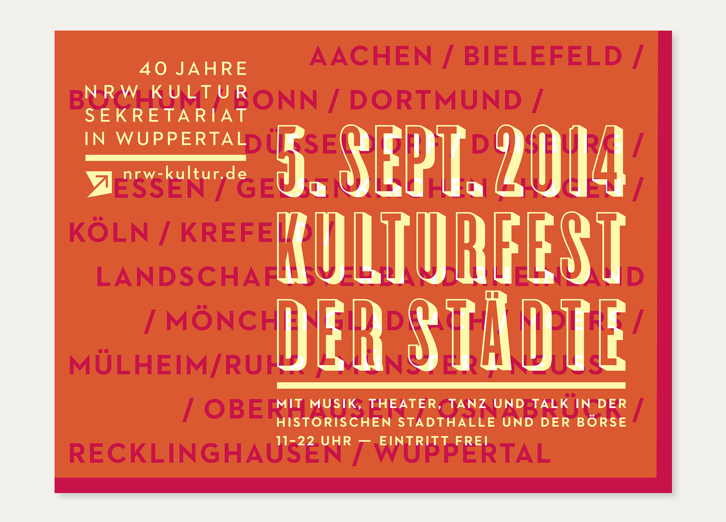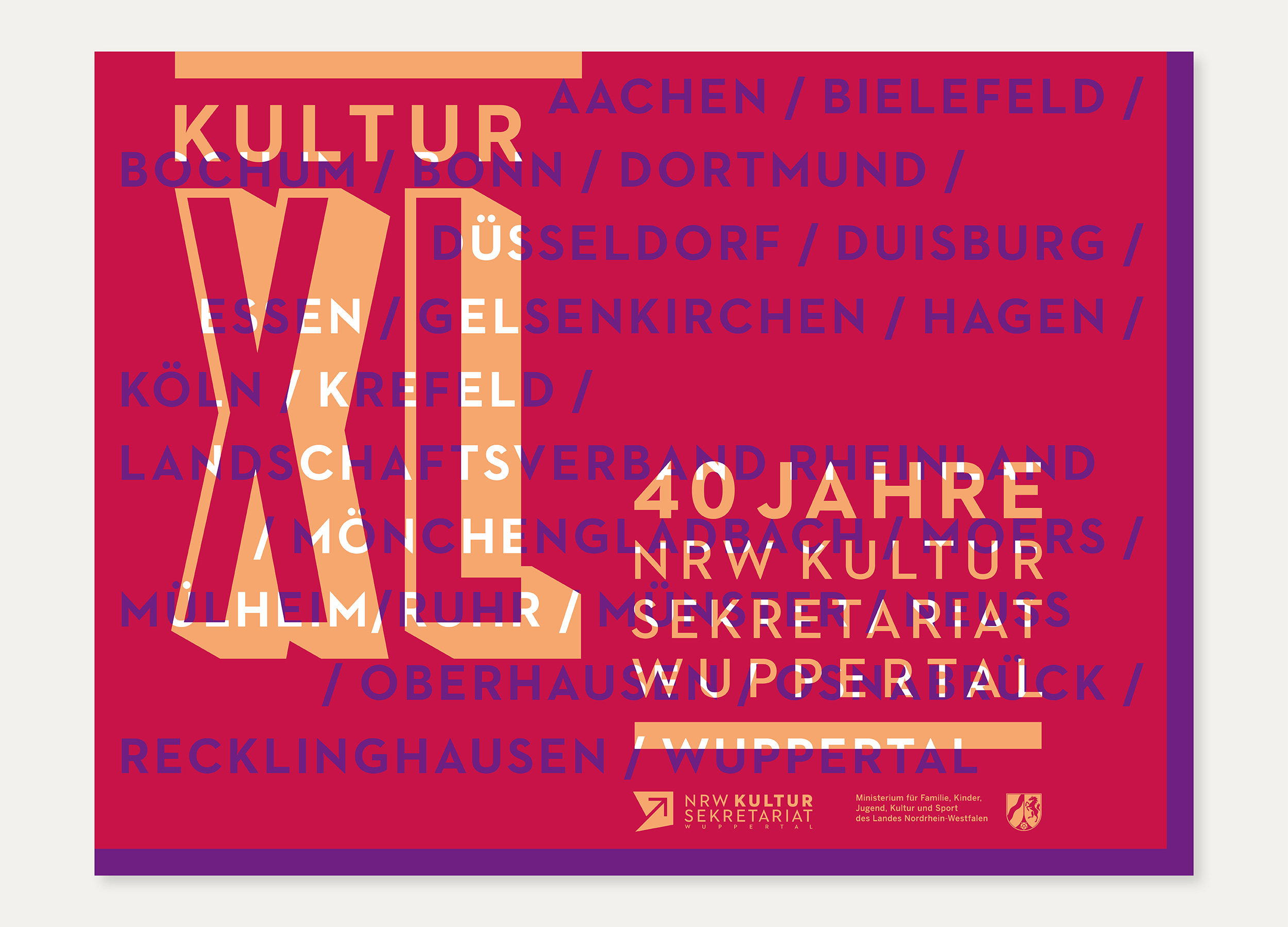 Das NRW Kultursekretariat versteht sich selbst als eine Institution die für und durch die beteiligten Städte hindurch wirkt. Die Gestaltung für das 40‐jährige Jubiläum thematisiert genau diese Art des Hindurchwirkens mittels einer grafischen Überlagerung und Verschränkung von Städten und Haupttitel.