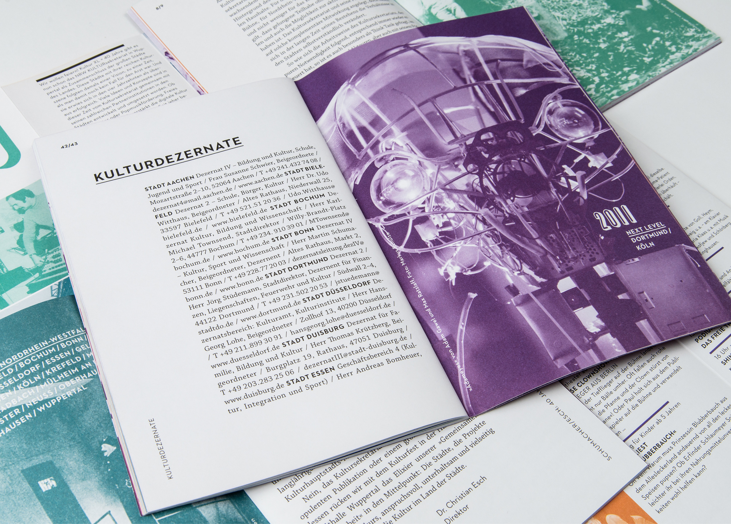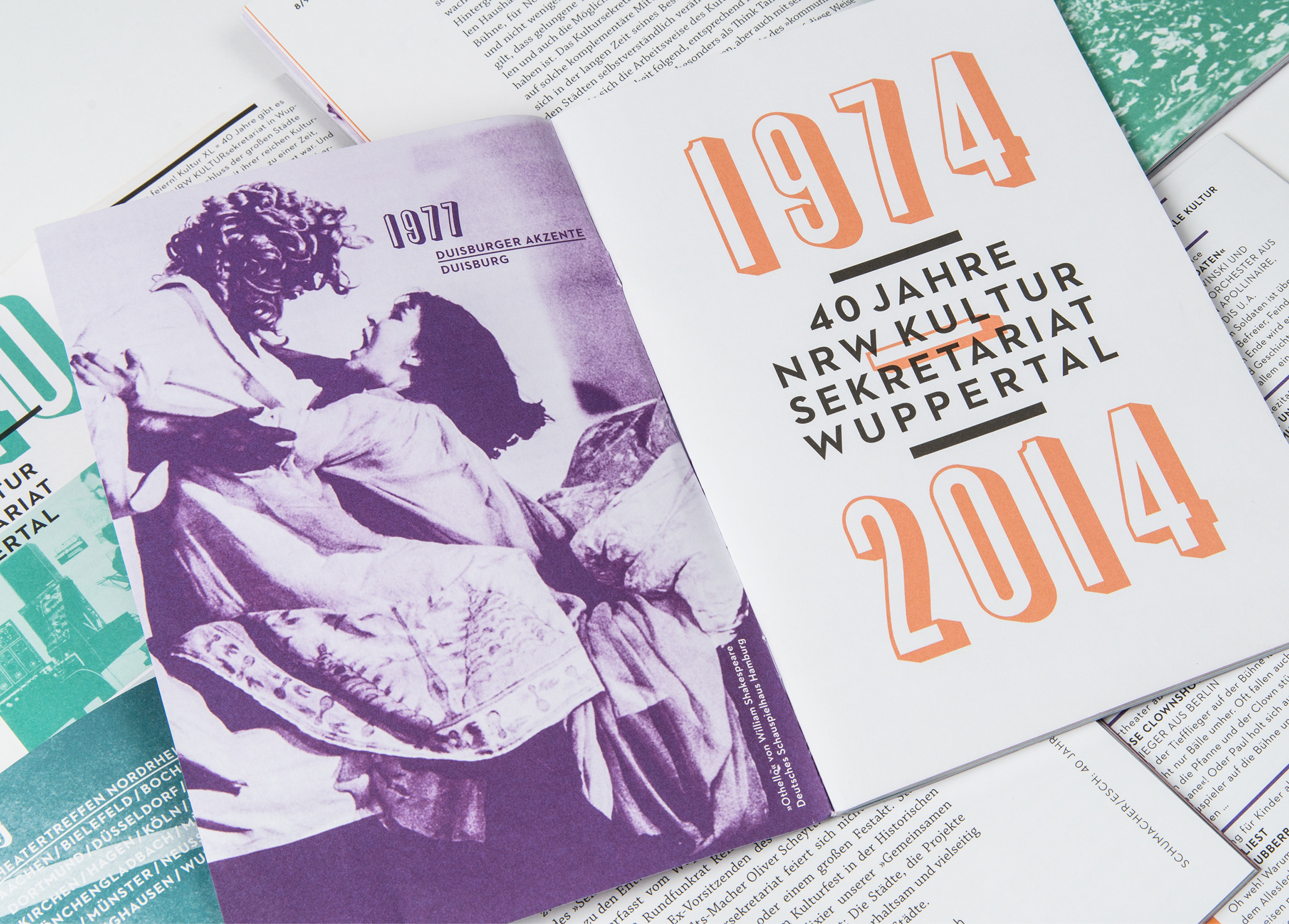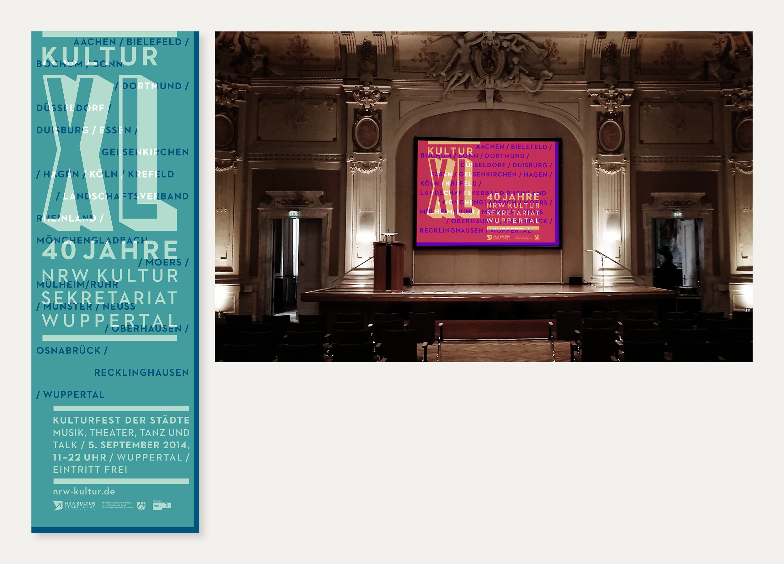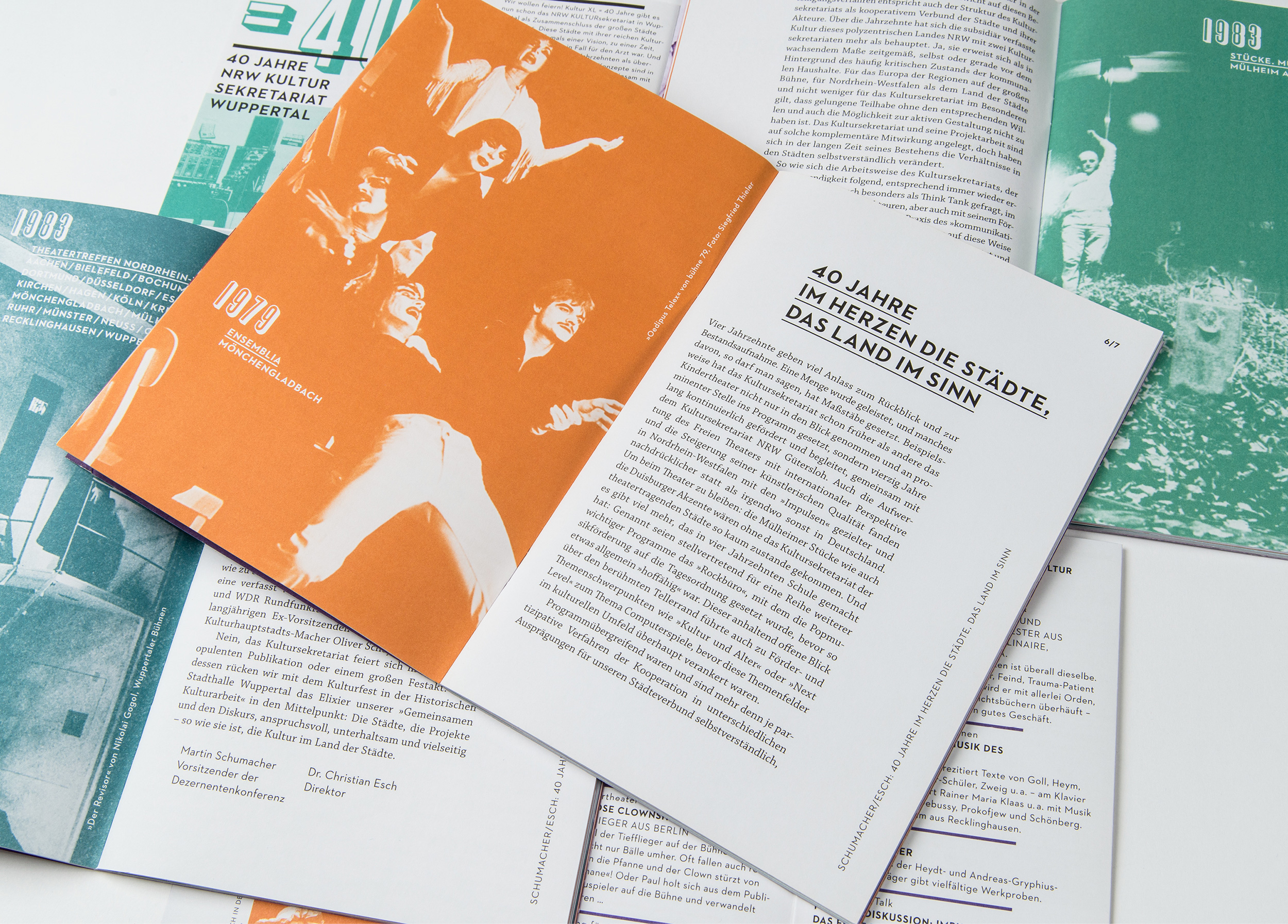 Das NRW Kultursekretariat versteht sich selbst als eine Institution die für und durch die beteiligten Städte hindurch wirkt. Die Gestaltung für das 40‐jährige Jubiläum thematisiert genau diese Art des Hindurchwirkens mittels einer grafischen Überlagerung und Verschränkung von Städten und Haupttitel.