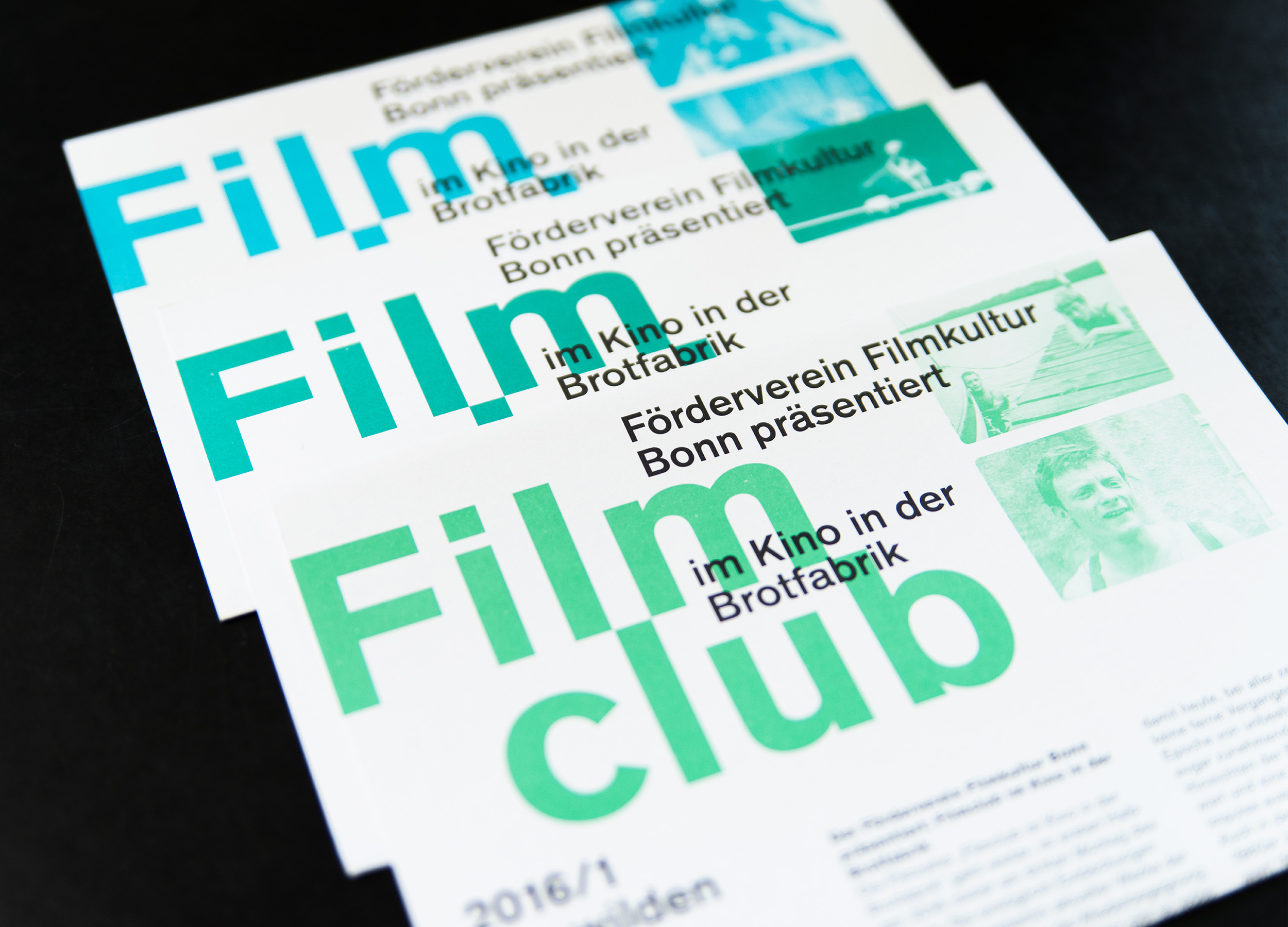 Der Filmclub der Bonner Kinemathek präsentiert ein kuratiertes Filmprogramm zu wechselnden Themen anhand von analogen Originalkopien aus dem Archiv der Kinemathek. Er sieht sich in der Tradition der Filmclubs, die in den 50er und 60er Jahren entstanden und einen diskursiven Umgang mit dem Medium Film etablierten. Die Gestaltung erinnert an diese Zeit indem sie bewusst stilistische Zitate aufgreift – wie z.B. die Schriftwahl (Akzidenz Grotesk) oder die schmalen Spalten der »Schweizer Typografie«, die ihre Hochzeit in den 50/60er Jahren hatte.