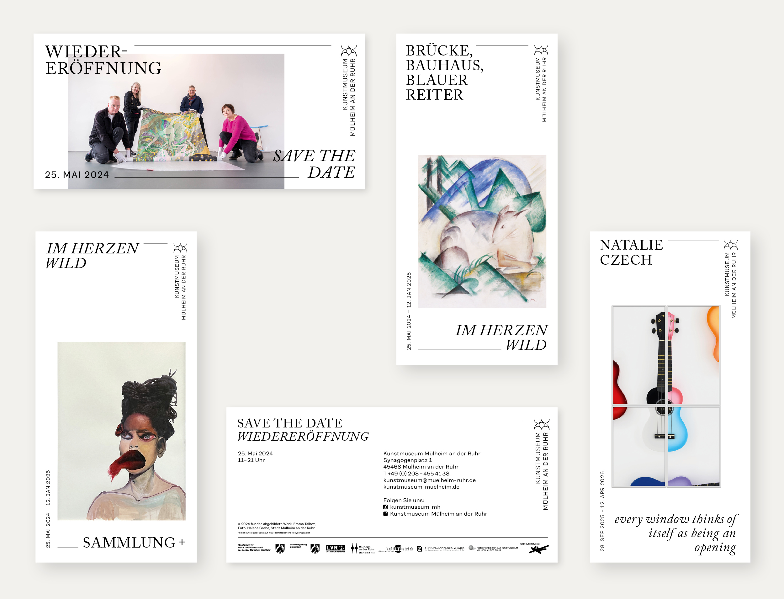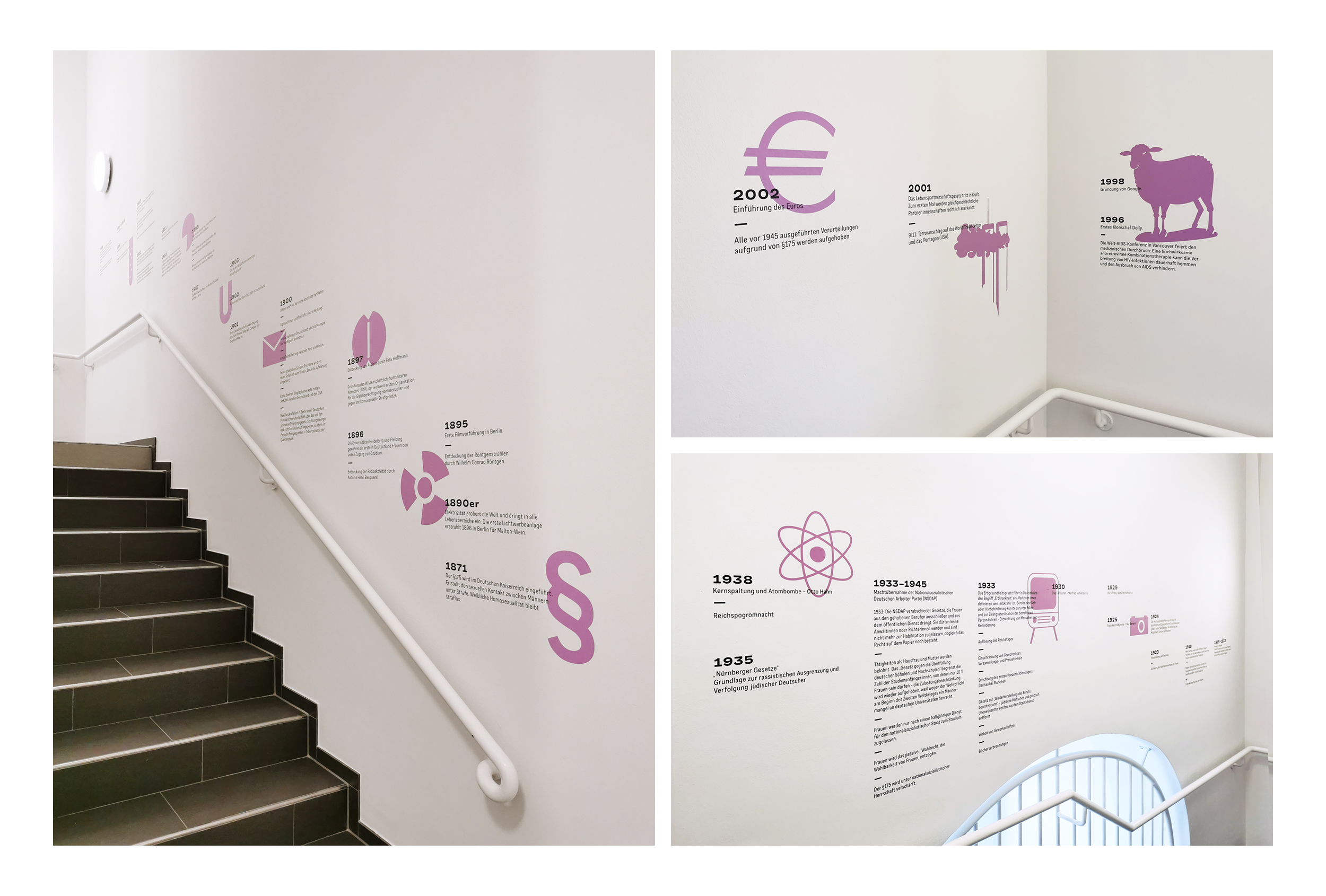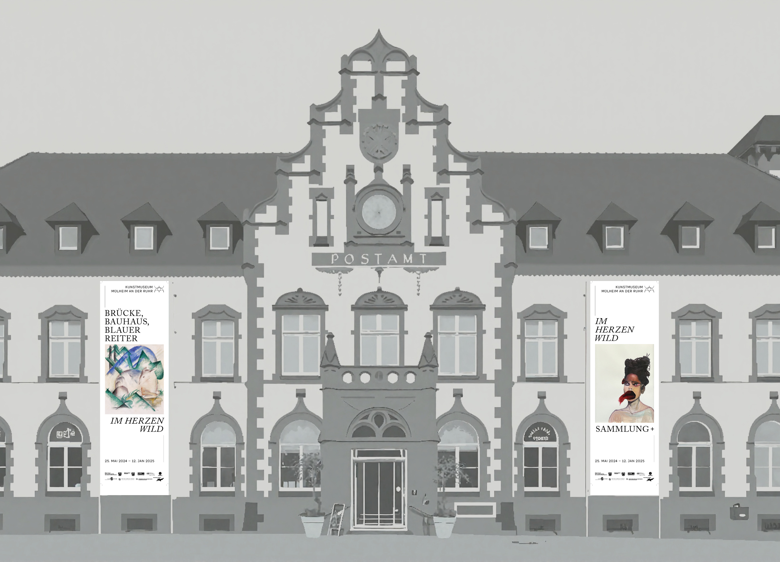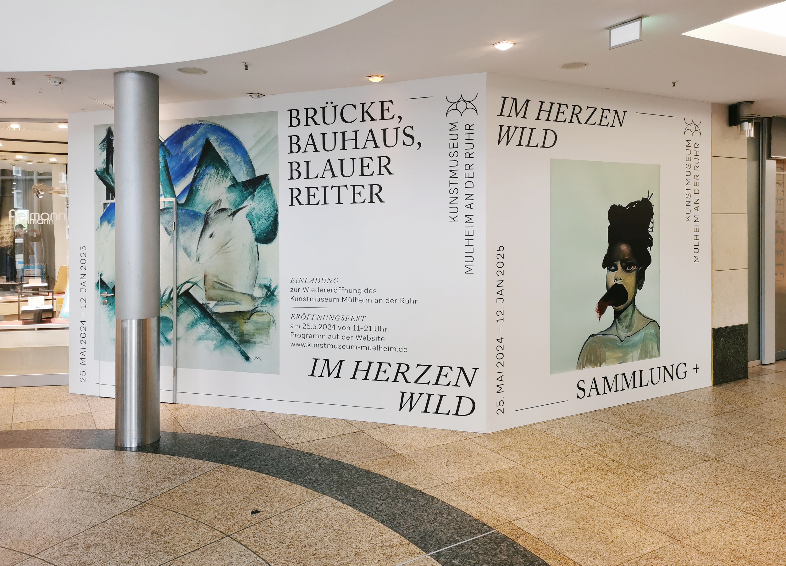 Im Zuge der Wiedereröffnung 2024 erhielt das Kunstmuseum von uns ein neues Erscheinungsbild. Alle Medien folgen dabei einer ähnlichen Anatomie. Diese stellt ein Bildmotiv in den Mitteplunkt, lässt aber ansonsten große Freiheiten in der Gestaltung. Außerdem haben wir für Subheadlines und Mengensatz eine Variable-Font-Schriftart entwickelt, die sich von dünn bis dick, und von schmal bis breit verändern lässt. Das Logo des Museums wurde nur dezent überarbeitet, da es bereits gut etabliert war und auf einem Hauptelement der Fassade des Gebäudes basiert. Im Treppenhaus entstand ein Zeitstrahl, der die Geschichte des Museums und wichtige weltpolitische Ereignisse gegenüberstellt.