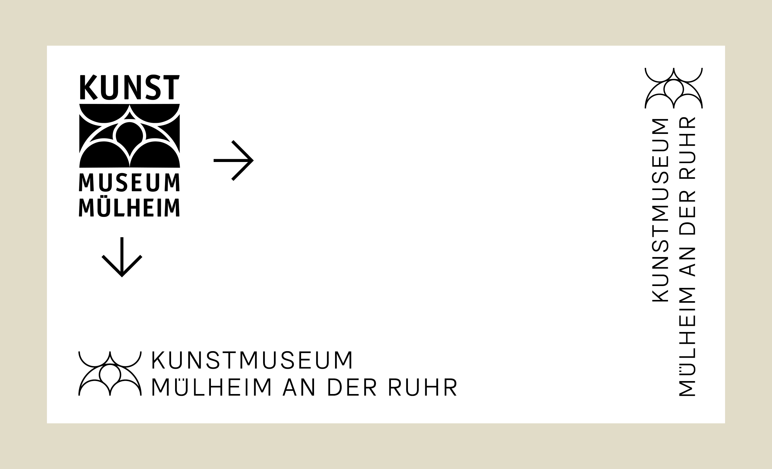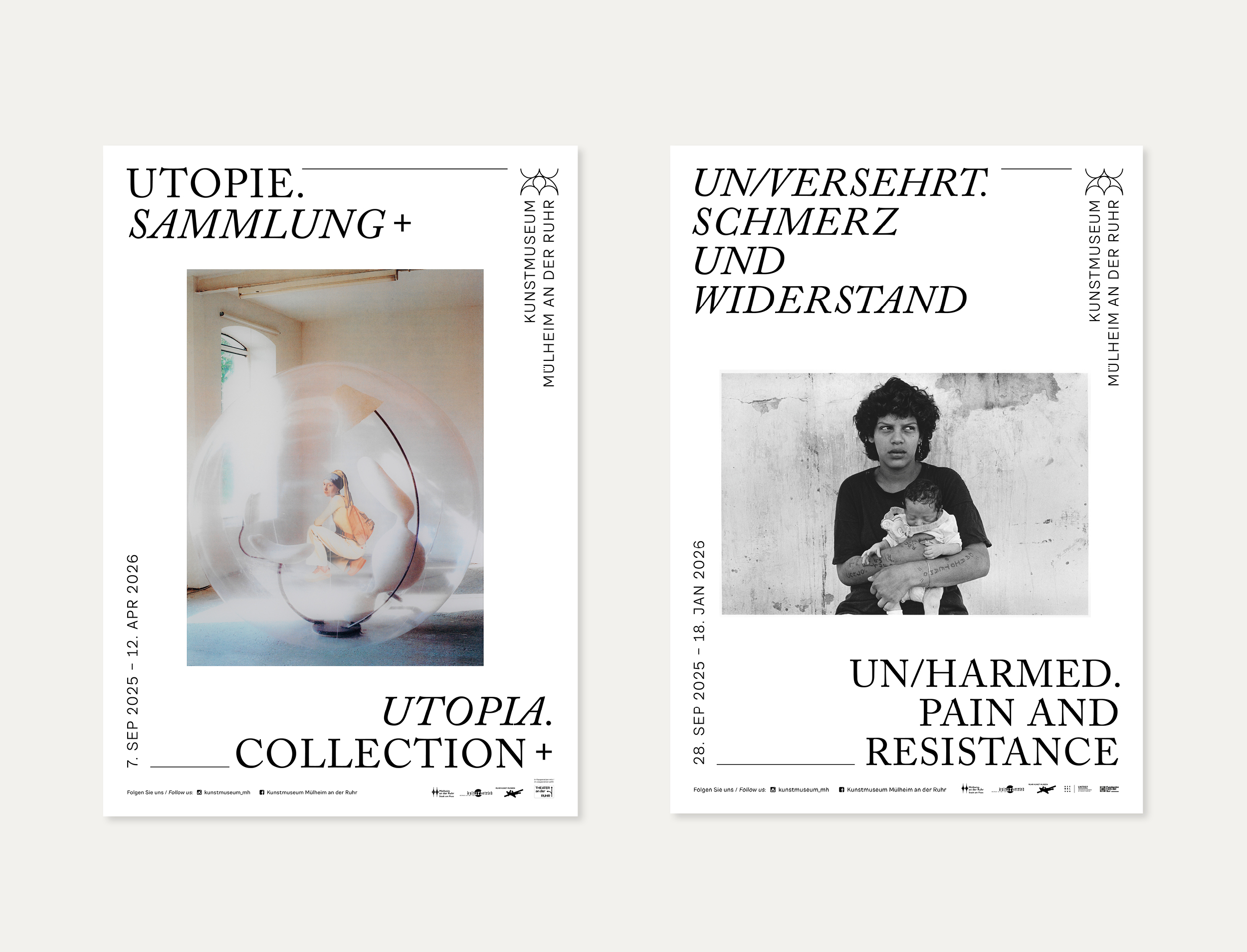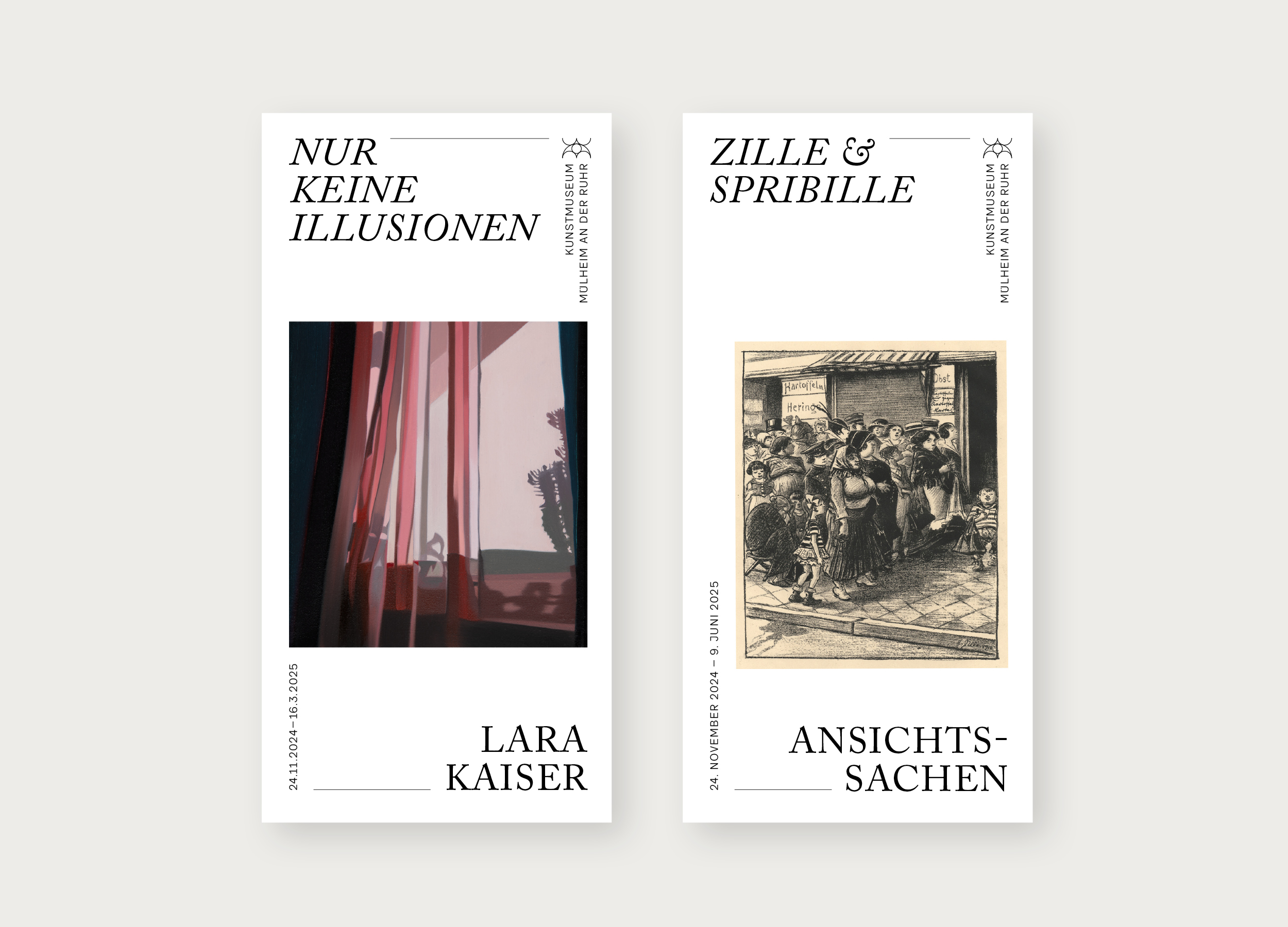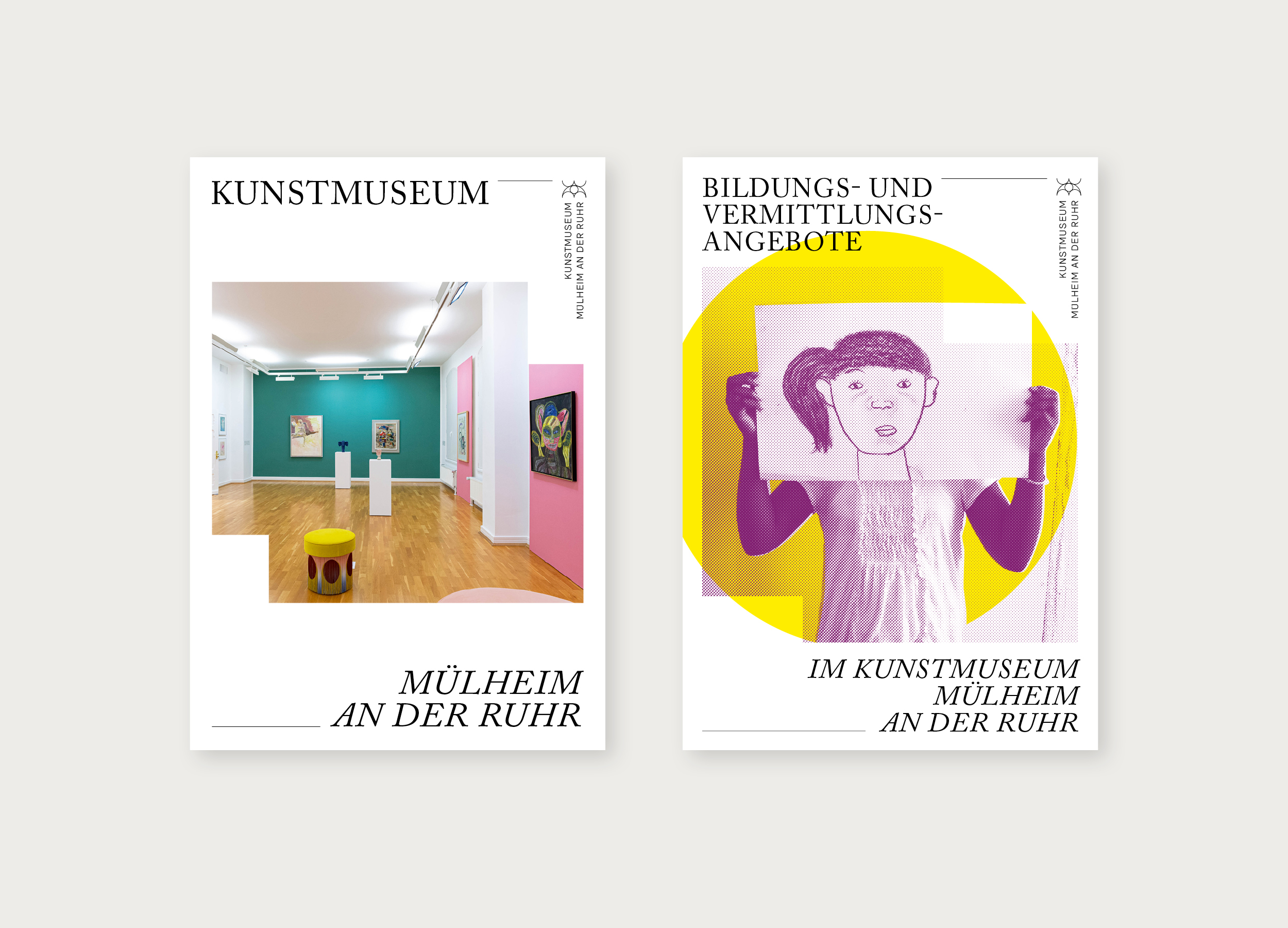 Im Zuge der Wiedereröffnung 2024 erhielt das Kunstmuseum von uns ein neues Erscheinungsbild. Alle Medien folgen dabei einer ähnlichen Anatomie. Diese stellt ein Bildmotiv in den Mitteplunkt, lässt aber ansonsten große Freiheiten in der Gestaltung. Außerdem haben wir für Subheadlines und Mengensatz eine Variable-Font-Schriftart entwickelt, die sich von dünn bis dick, und von schmal bis breit verändern lässt. Das Logo des Museums wurde nur dezent überarbeitet, da es bereits gut etabliert war und auf einem Hauptelement der Fassade des Gebäudes basiert. Im Treppenhaus entstand ein Zeitstrahl, der die Geschichte des Museums und wichtige weltpolitische Ereignisse gegenüberstellt.