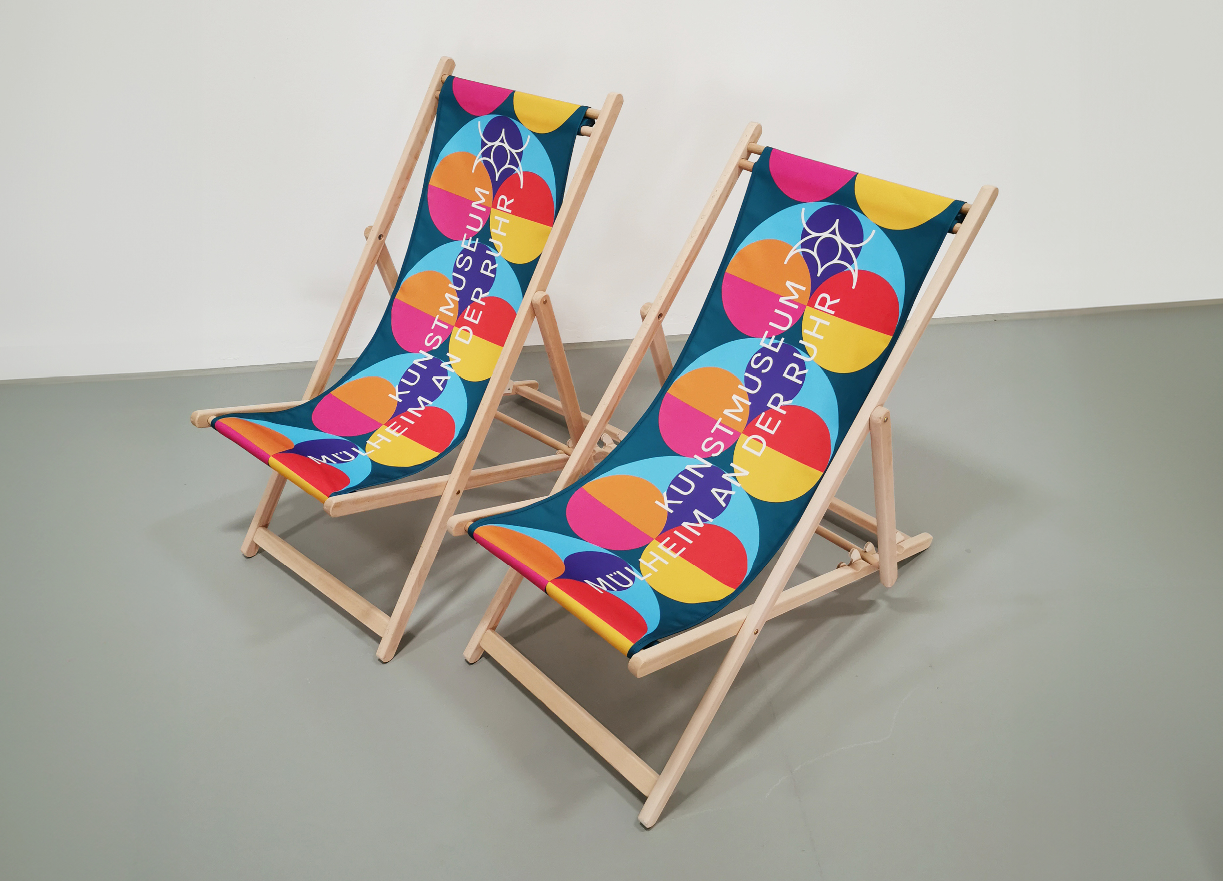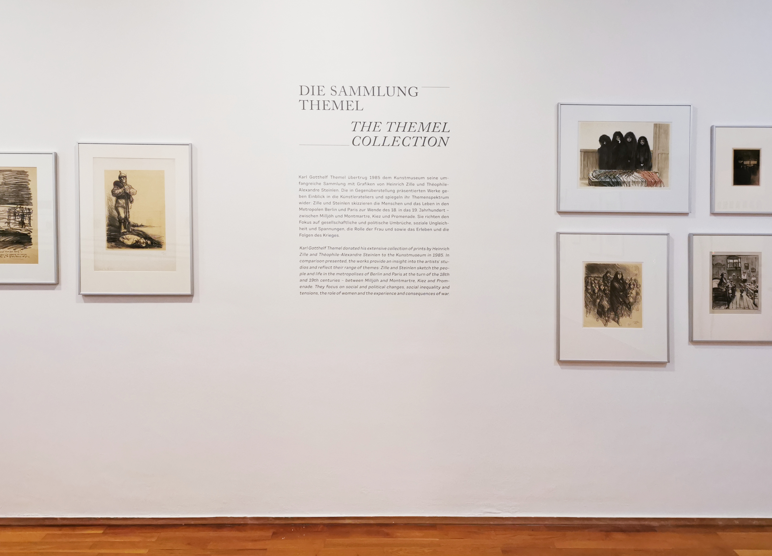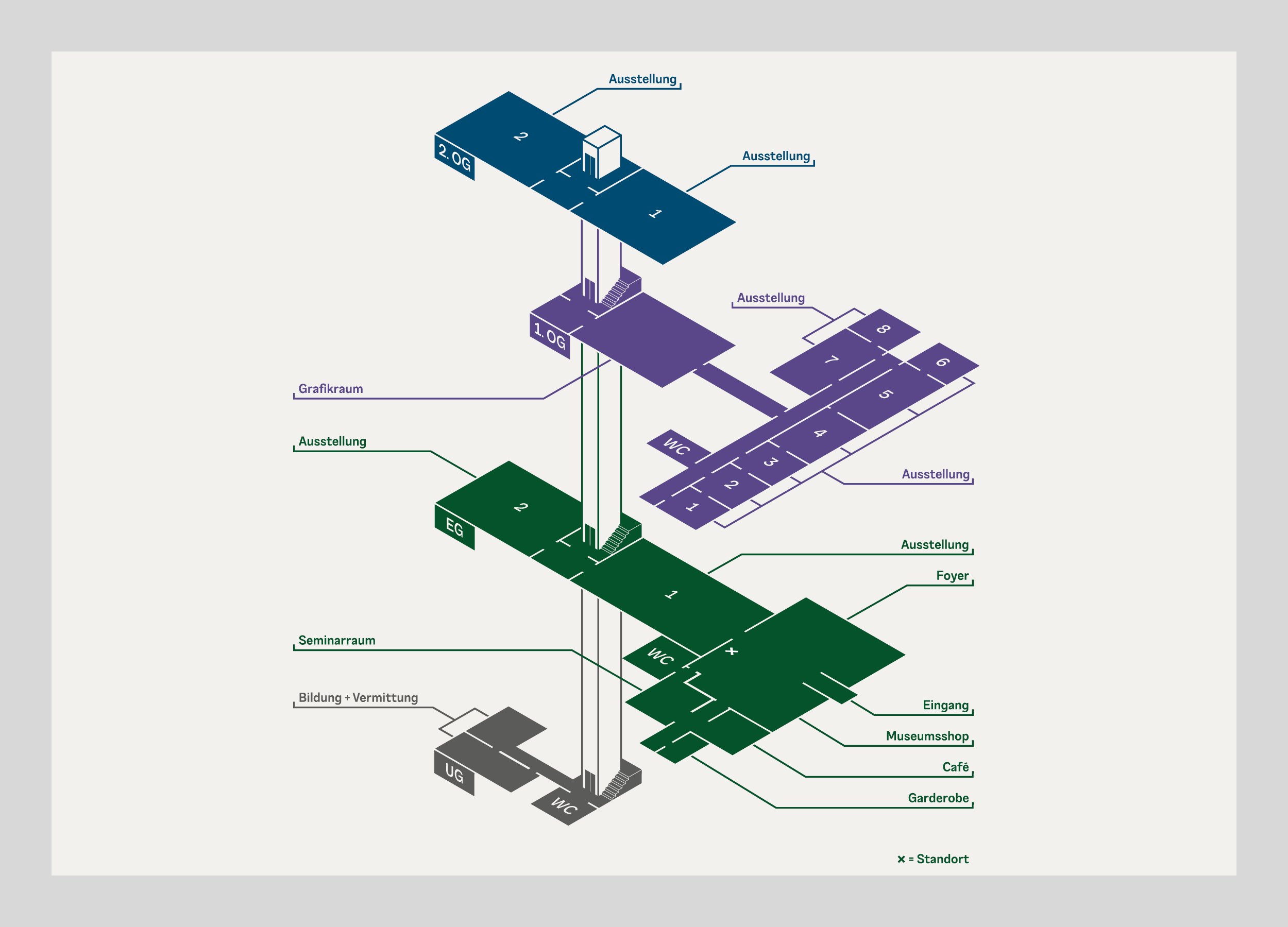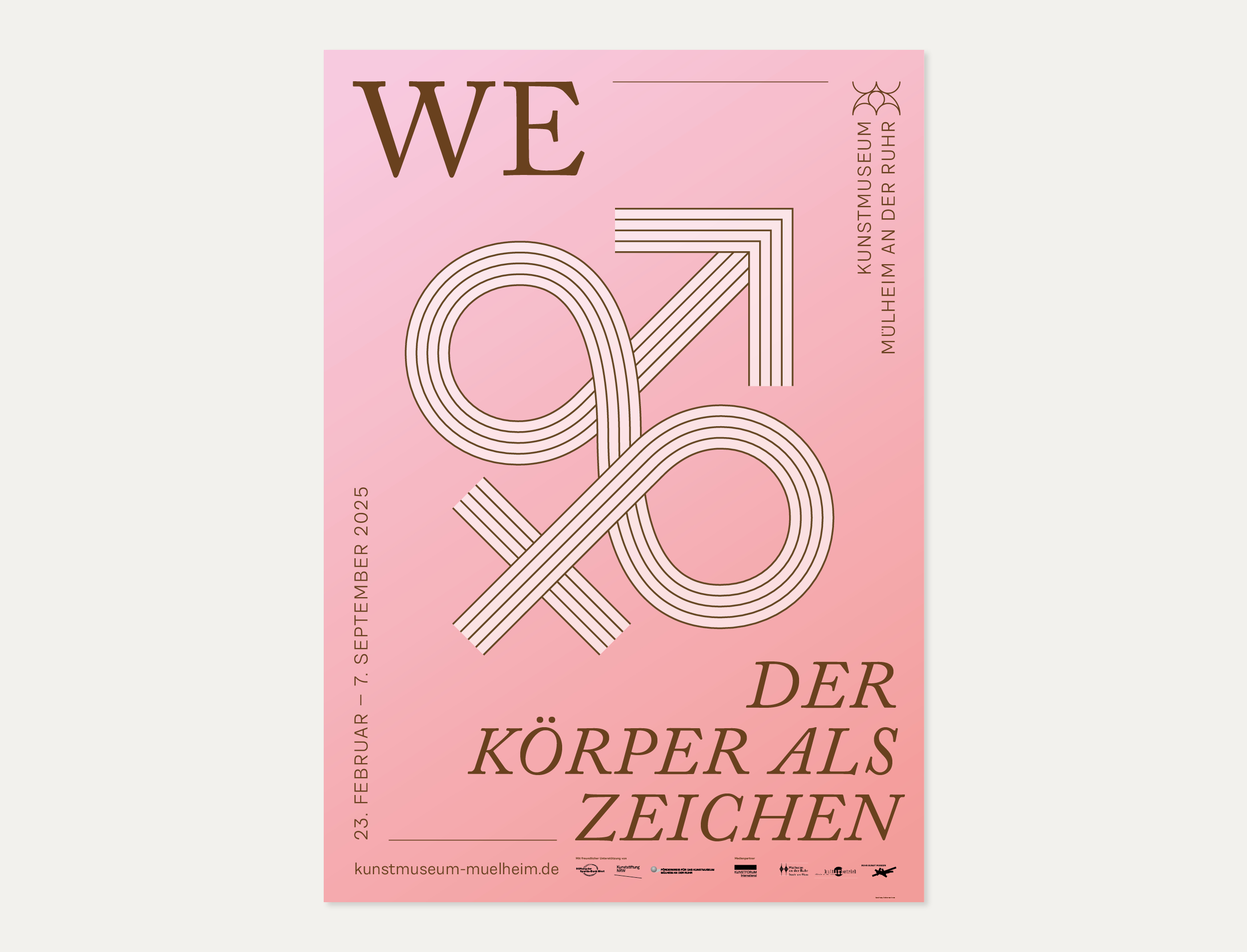 Im Zuge der Wiedereröffnung 2024 erhielt das Kunstmuseum von uns ein neues Erscheinungsbild. Alle Medien folgen dabei einer ähnlichen Anatomie. Diese stellt ein Bildmotiv in den Mitteplunkt, lässt aber ansonsten große Freiheiten in der Gestaltung. Außerdem haben wir für Subheadlines und Mengensatz eine Variable-Font-Schriftart entwickelt, die sich von dünn bis dick, und von schmal bis breit verändern lässt. Das Logo des Museums wurde nur dezent überarbeitet, da es bereits gut etabliert war und auf einem Hauptelement der Fassade des Gebäudes basiert. Im Treppenhaus entstand ein Zeitstrahl, der die Geschichte des Museums und wichtige weltpolitische Ereignisse gegenüberstellt.