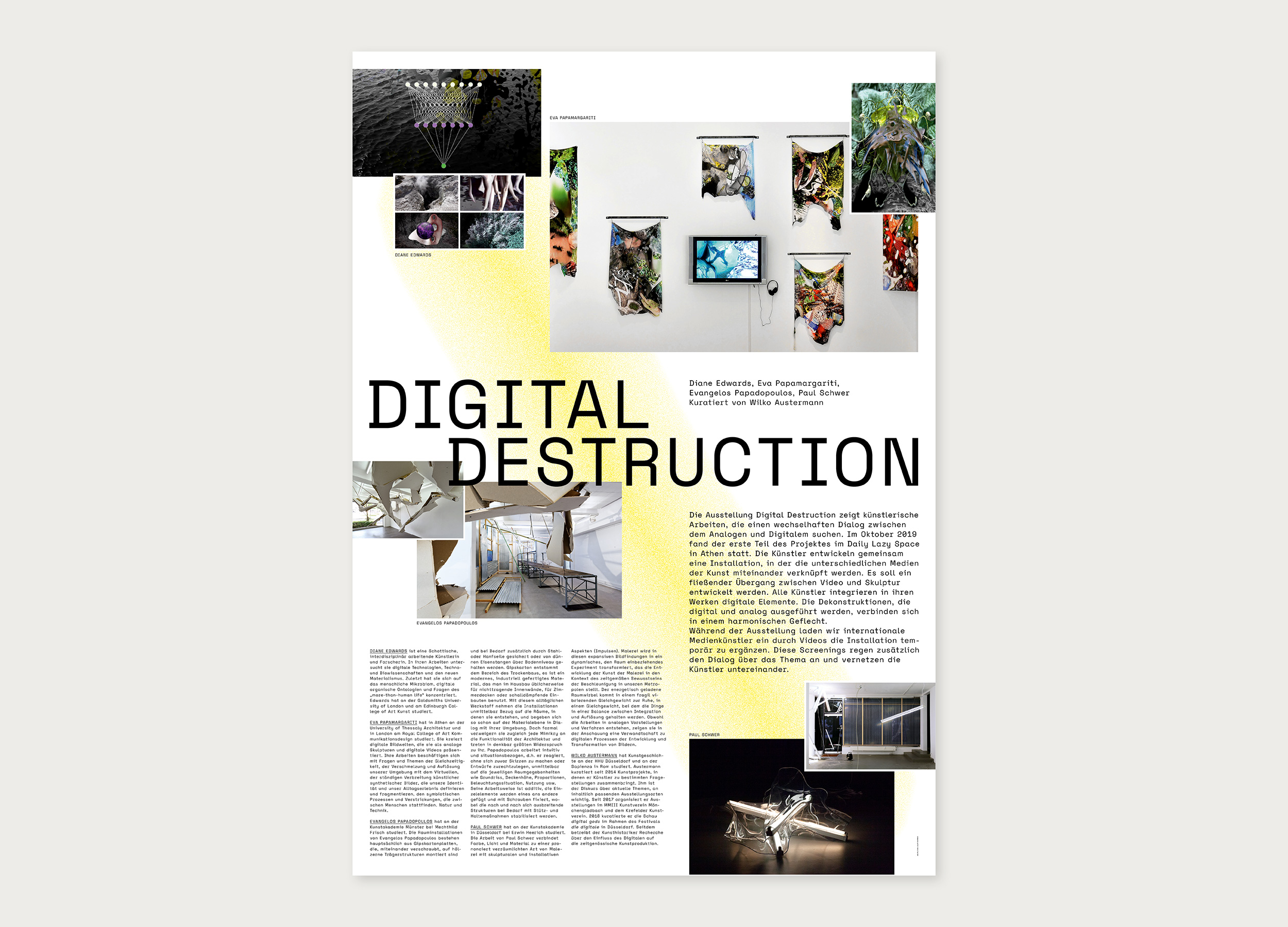 Die Ausstellung »Digital Destruction« zeigt künstlerische Arbeiten, die einen wechselhaften Dialog zwischen Analogem und Digitalem suchen. Ziel ist ein fließender Übergang zwischen Video und Skulptur – digitale und analoge Destruktionen verbinden sich zu einem unberechenbaren Geflecht. Das Plakat ist zur Präsentation des Ausstellungskonzeptes entstanden.