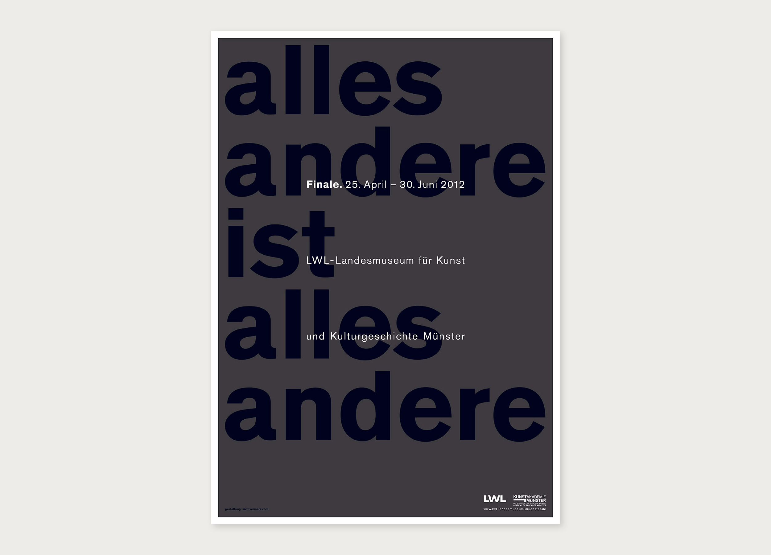 Die Ausstellung »Finale.alles andere ist alles andere«, eine Kooperation zwischen dem Landesmuseum für Kunst und Kulturgeschichte und der Kunsthochschule Münster, lud junge Künstlerinnen und Künstler ein, Stellung zur Kontextualität aktueller Kunst und der Frage nach sogenannten Endpunkten der Kunstgeschichte zu nehmen. »alles andere ist alles andere« ist die Übersetzung eines Zitates von Ad Reinhardt: »Art is art. Everything else is everything else.« Bezug nehmend auf seine »letzten« (›schwarzen‹) Bilder ist sein Zitat in Farbe in den Hintergrund gedruckt, wird aber schwarz überdruckt, so dass sich ein noch schwärzeres Schwarz ergibt.