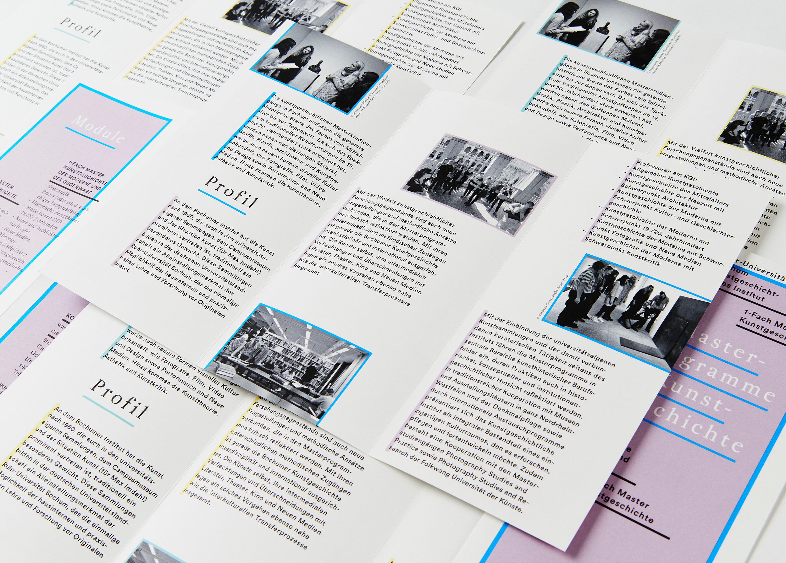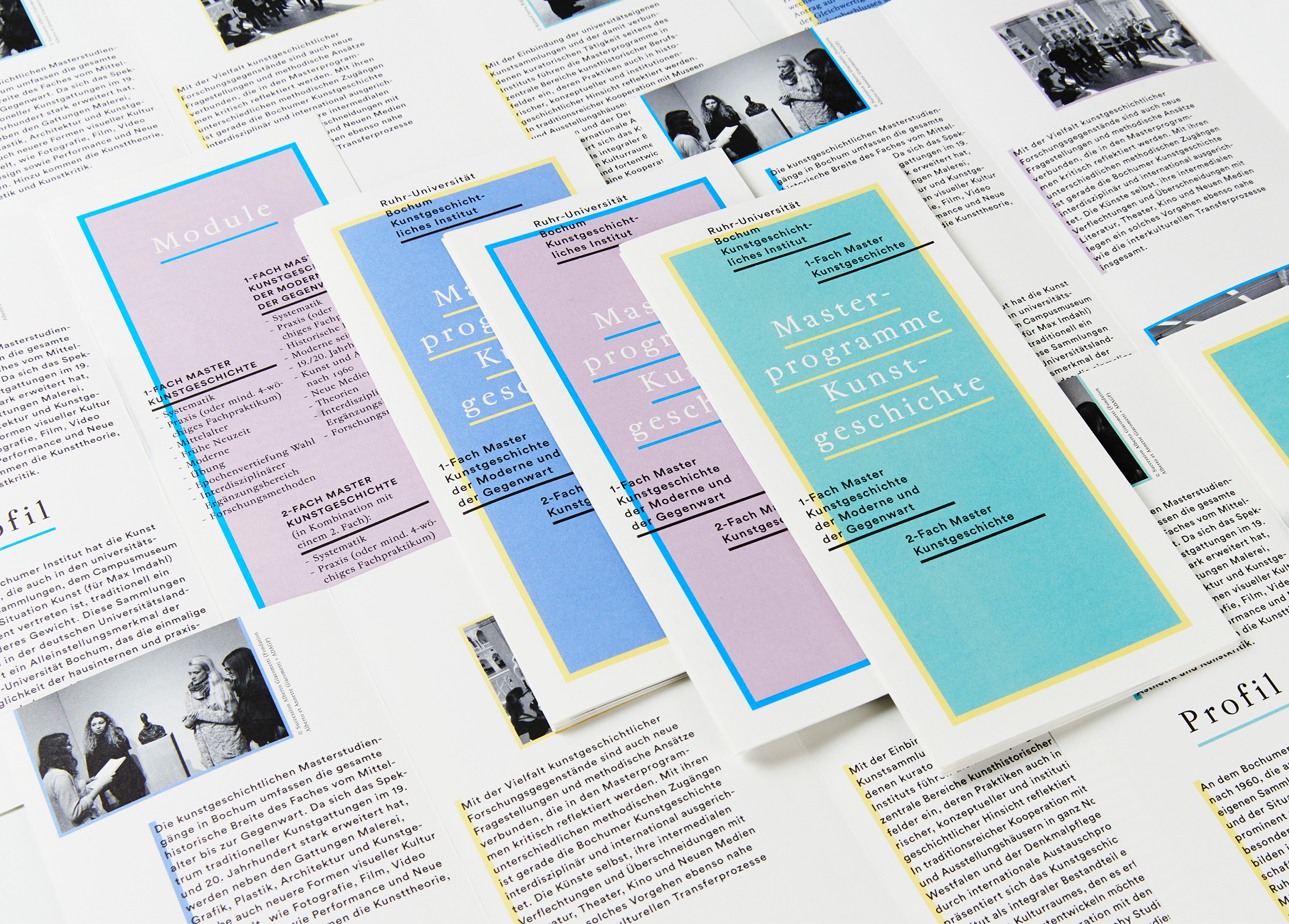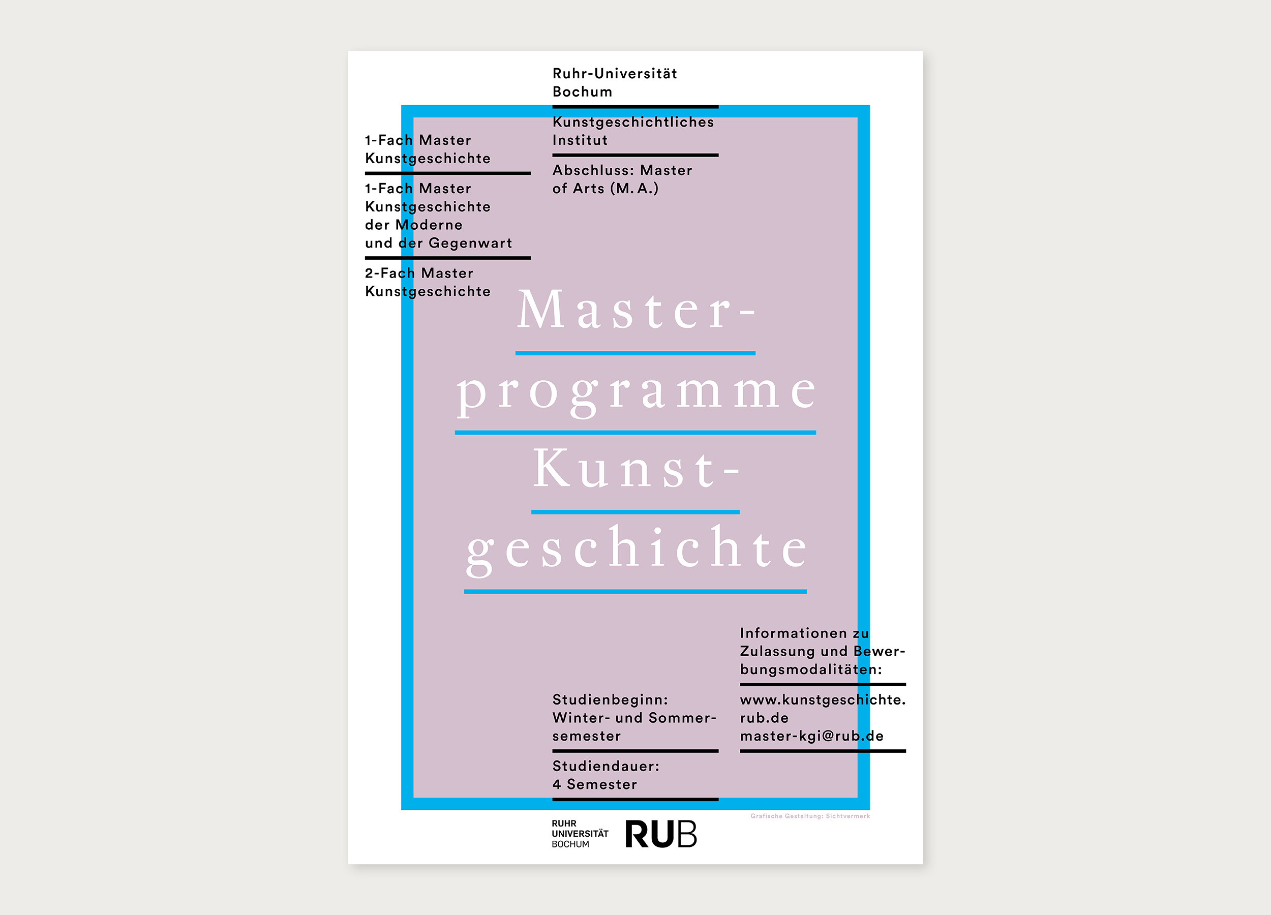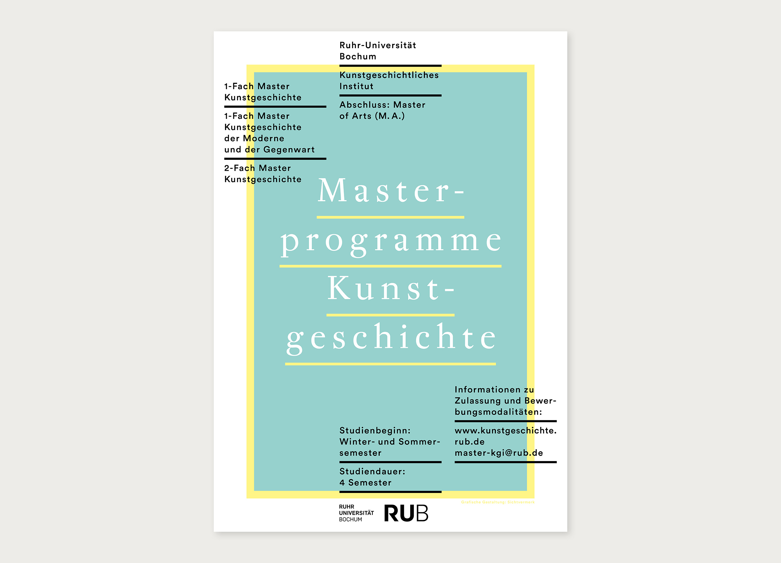 Für das Kunstgeschichtliche Institut an der Ruhr‐Universität Bochum entstanden Plakate und Flyer, die über die neuen Masterprogramme informieren. Da es verschiedene Schwerpunkte von klassisch bis zeitgenössisch gibt, spielt die Gestaltung mit der Kombination ebenso unterschiedlicher Designelemente.