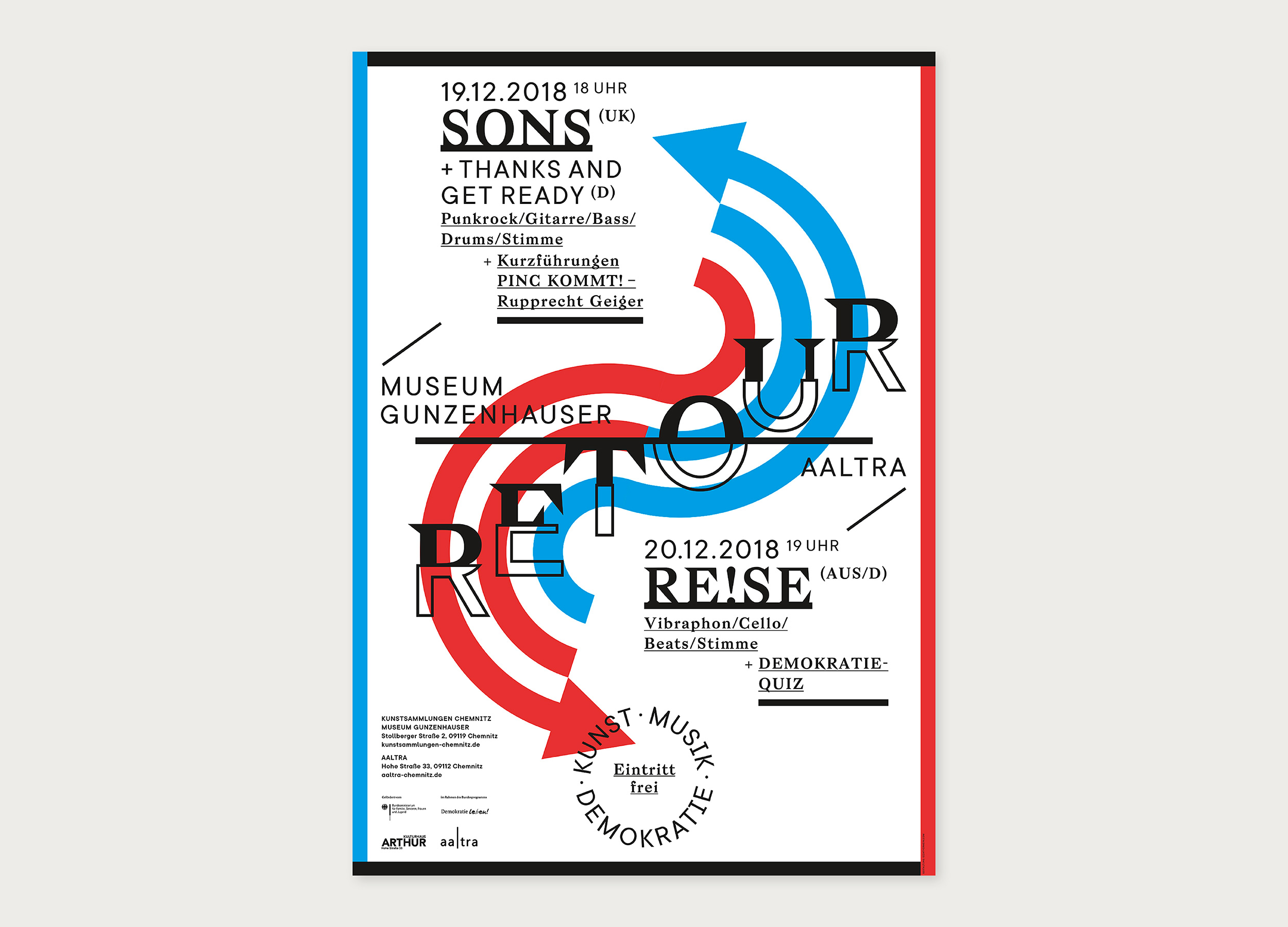 Kunst. Musik. Demokratie. Mit »Retour« laden die Kunstsammlungen Chemnitz zum Perspektivwechsel ein. Das Plakat wirbt für eine Musikveranstaltung, bei der eine Punkrock‐Band im Museum Gunzenhauser und eine Lounge‐Jazz‐Band in einer Punk‐Kneipe spielen.