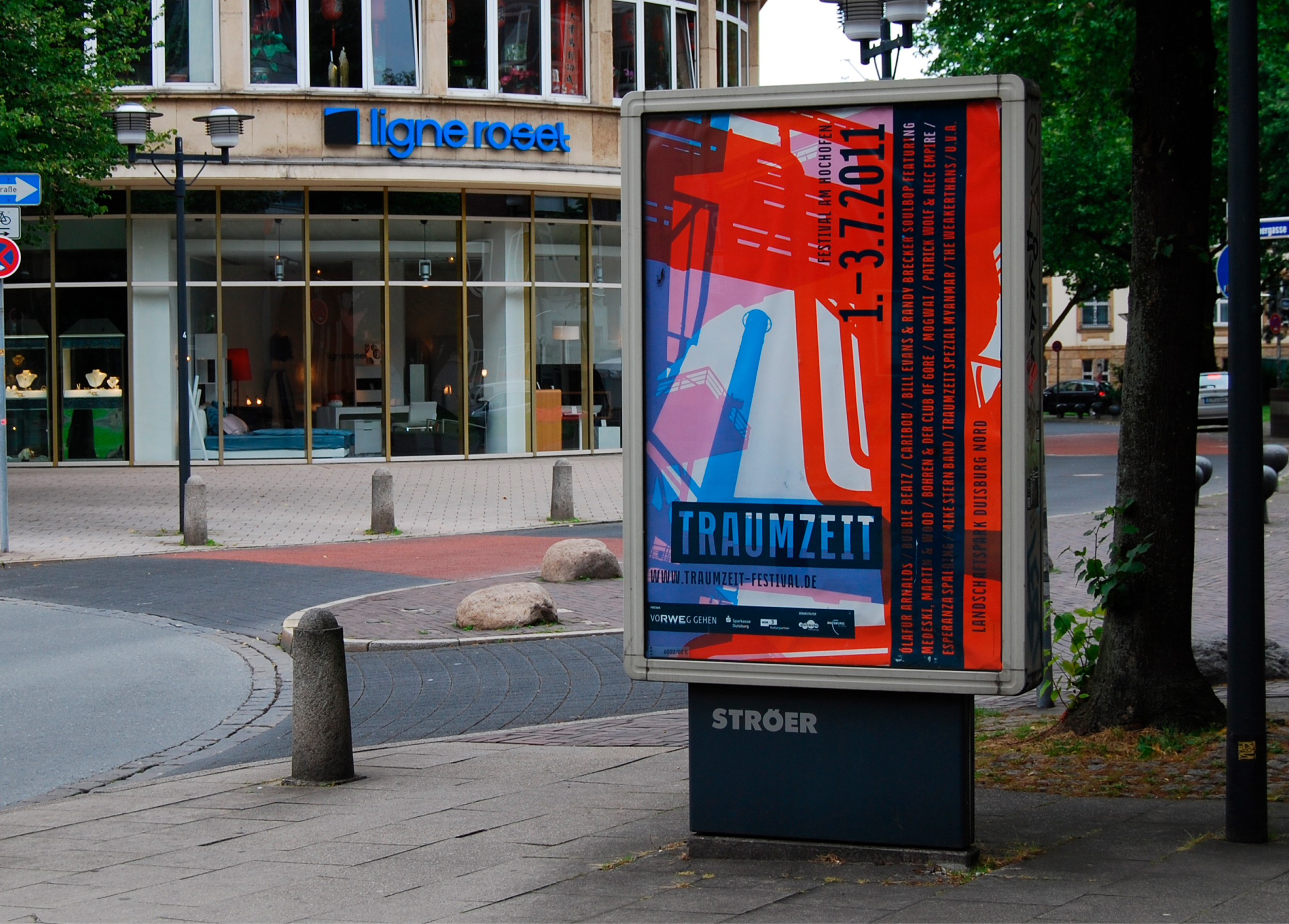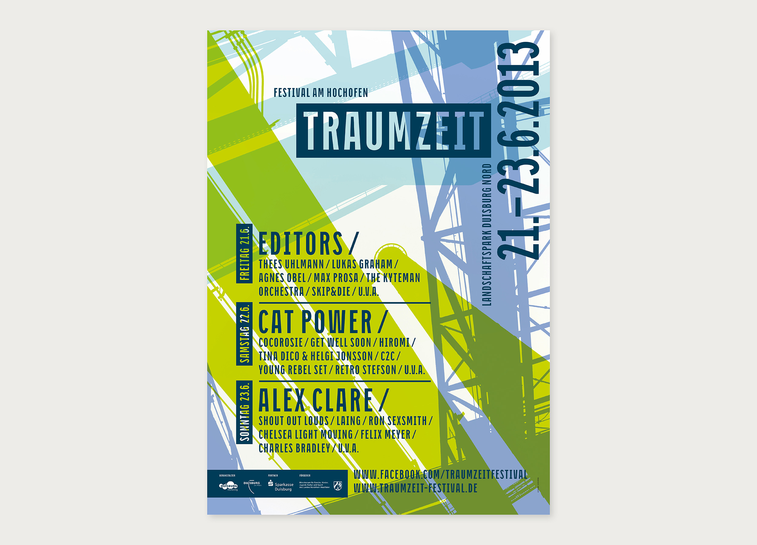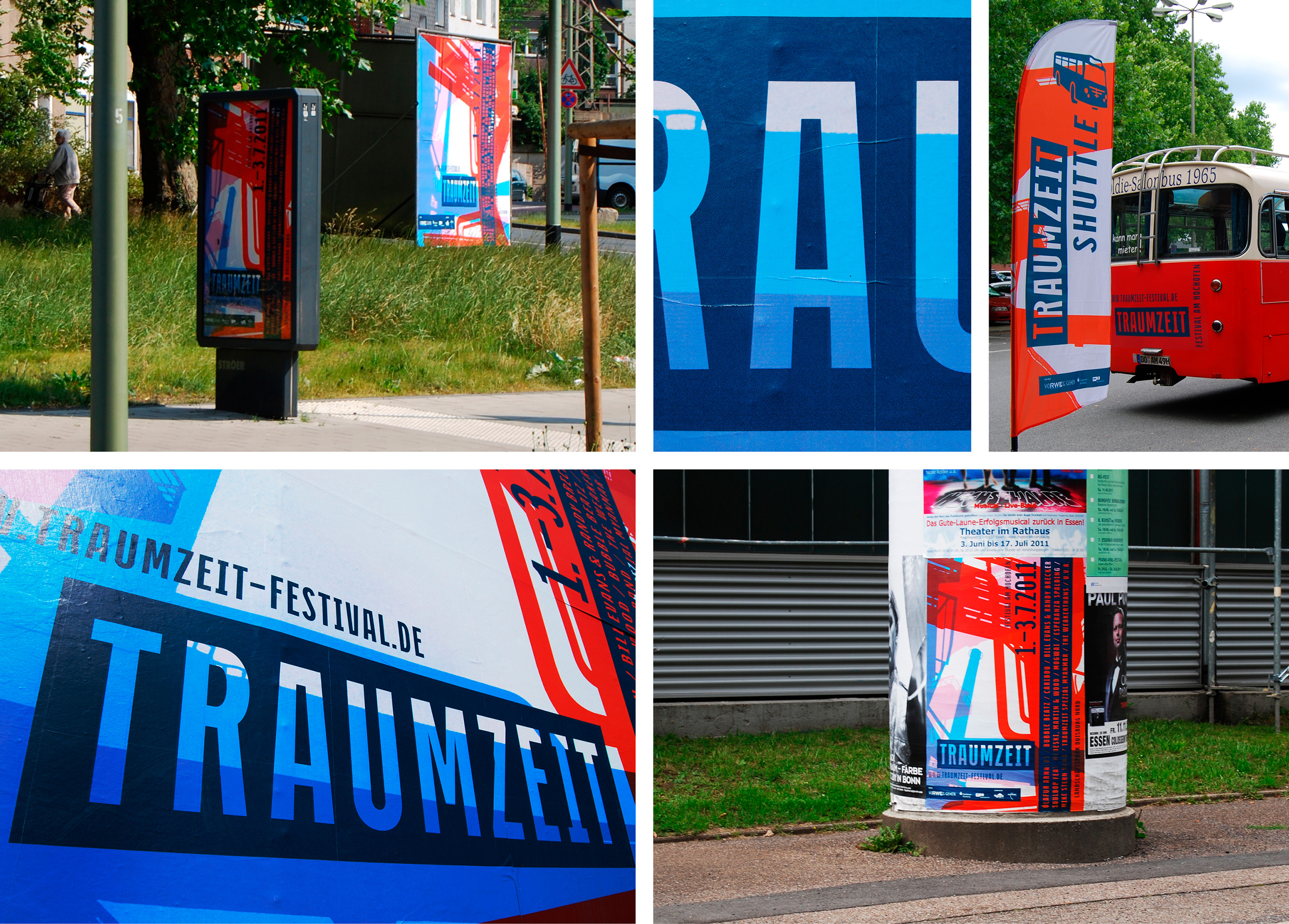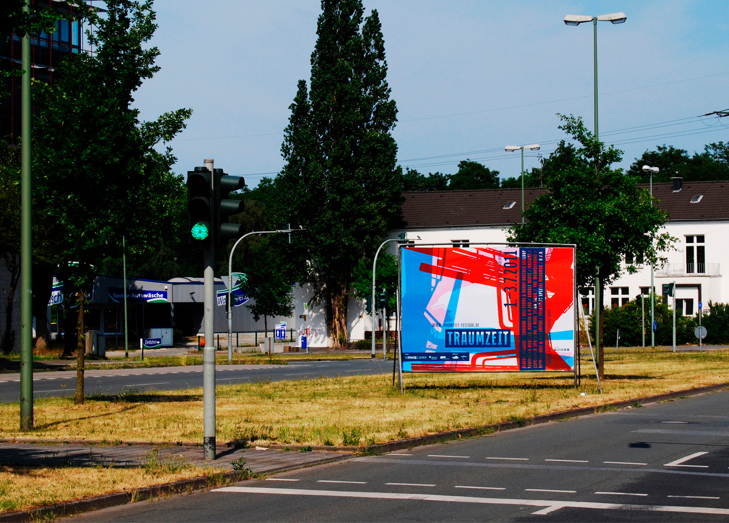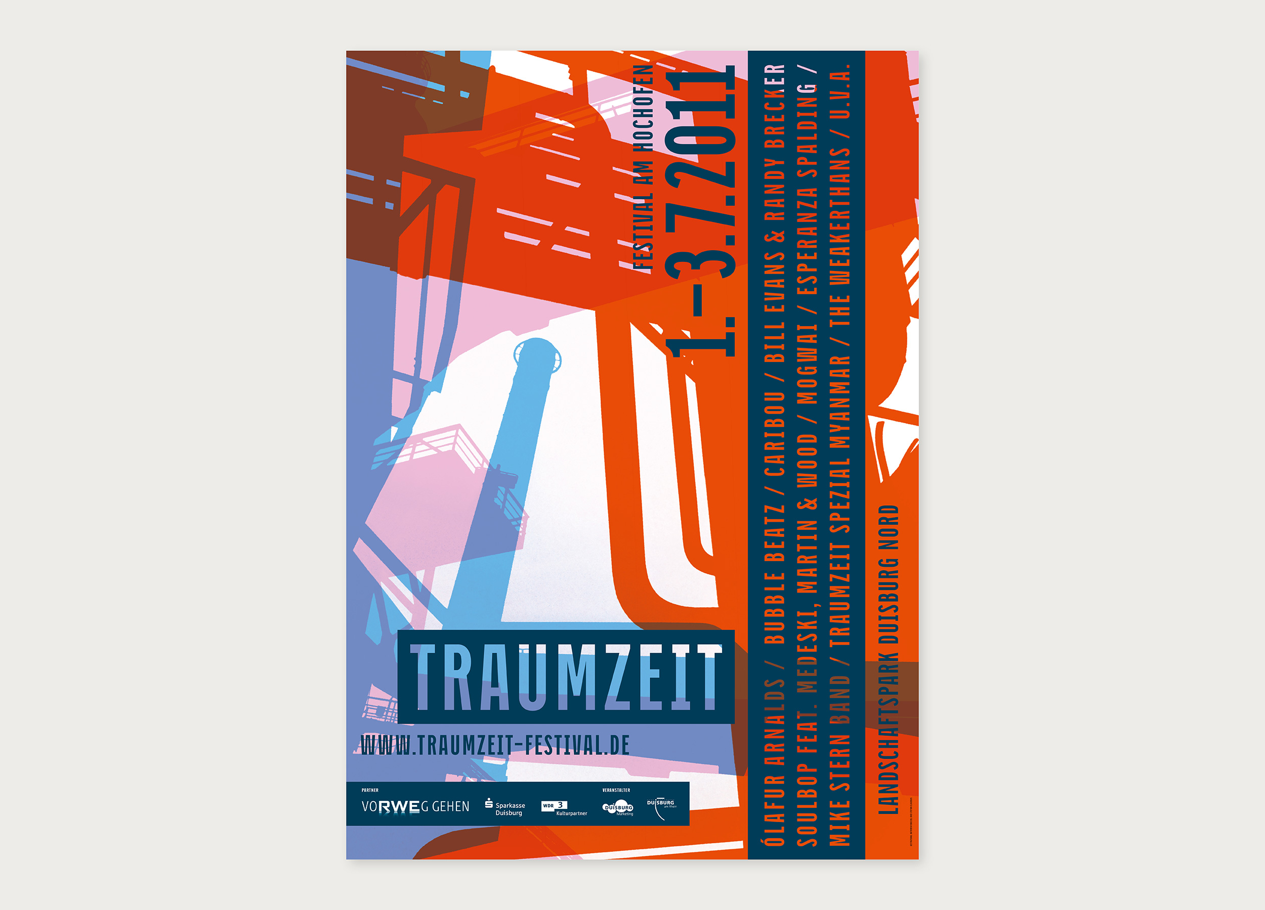 Die Gestaltung arbeitet mit abstrahierten Fotos des Landschaftsparks Duisburg Nord – ein ehemaliges Hüttenwerk, in dem das Festival stattfindet und das durch seine bizarre Kulisse aus Stahlkonstruktionen, Kesseln, Rohrleitungen und Schornsteinen eine ganze eigene Atmosphäre erzeugt. Durch Überschneidungen der verschieden‐farbigen Bildmotive entstehen neue Formen. So verweist die Gestaltung auf den genreübergreifenden Stilmix, der das Traumzeit‐Programm kennzeichnet.