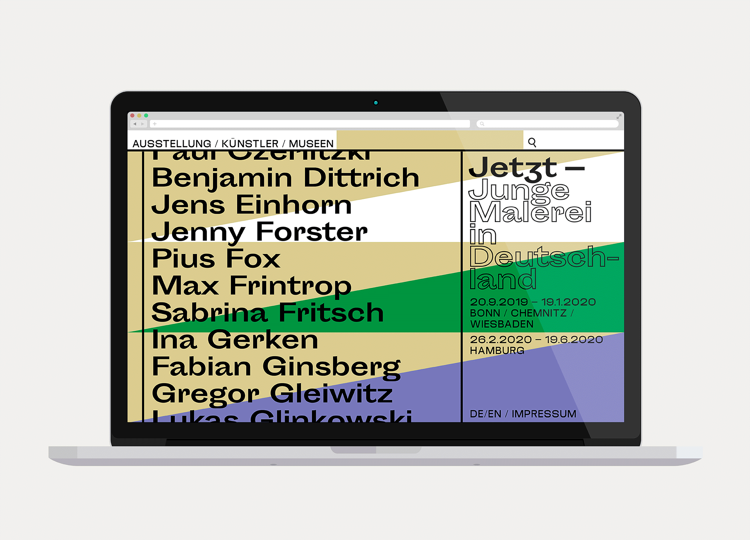Die Ausstellung »Jetzt – Junge Malerei in Deutschland« zeigte parallel im Kunstmuseum Bonn, den Kunstsammlungen Chemnitz und dem Museum Wiesbaden aktuelle Positionen der Malerei aus Deutschland. Dabei waren in jedem Haus andere Arbeiten der rund 53 jungen Künstlerinnen und Künstler zu sehen. Anschließend verdichteten sich die Werke in einer Ausstellung in den Deichtorhallen in Hamburg zu einer Auswahl.